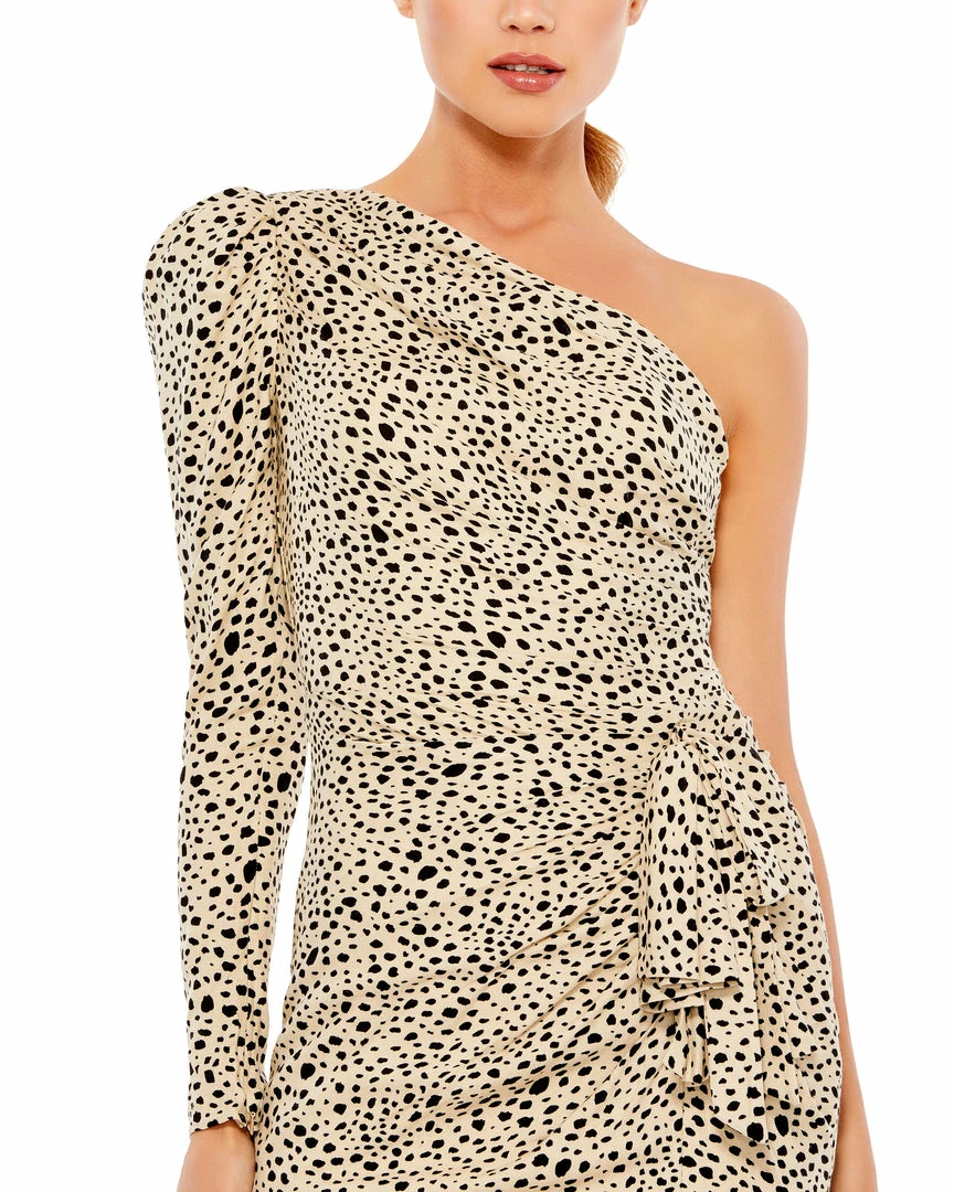 One-shoulder ruched animal print mini dress with a single puff sleeve and draping on the left side.