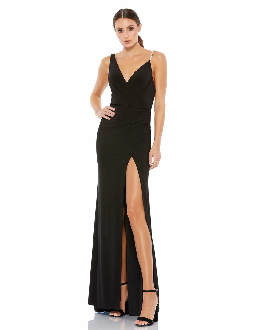 Chic asymmetrical strap gown featuring a v-neckline, a ruched waist, sexy lowcut back, and a floor-length skirt with a sweeping train and thigh-high slit. Left-side spaghetti strap is embellished with an elegant pearl trim.