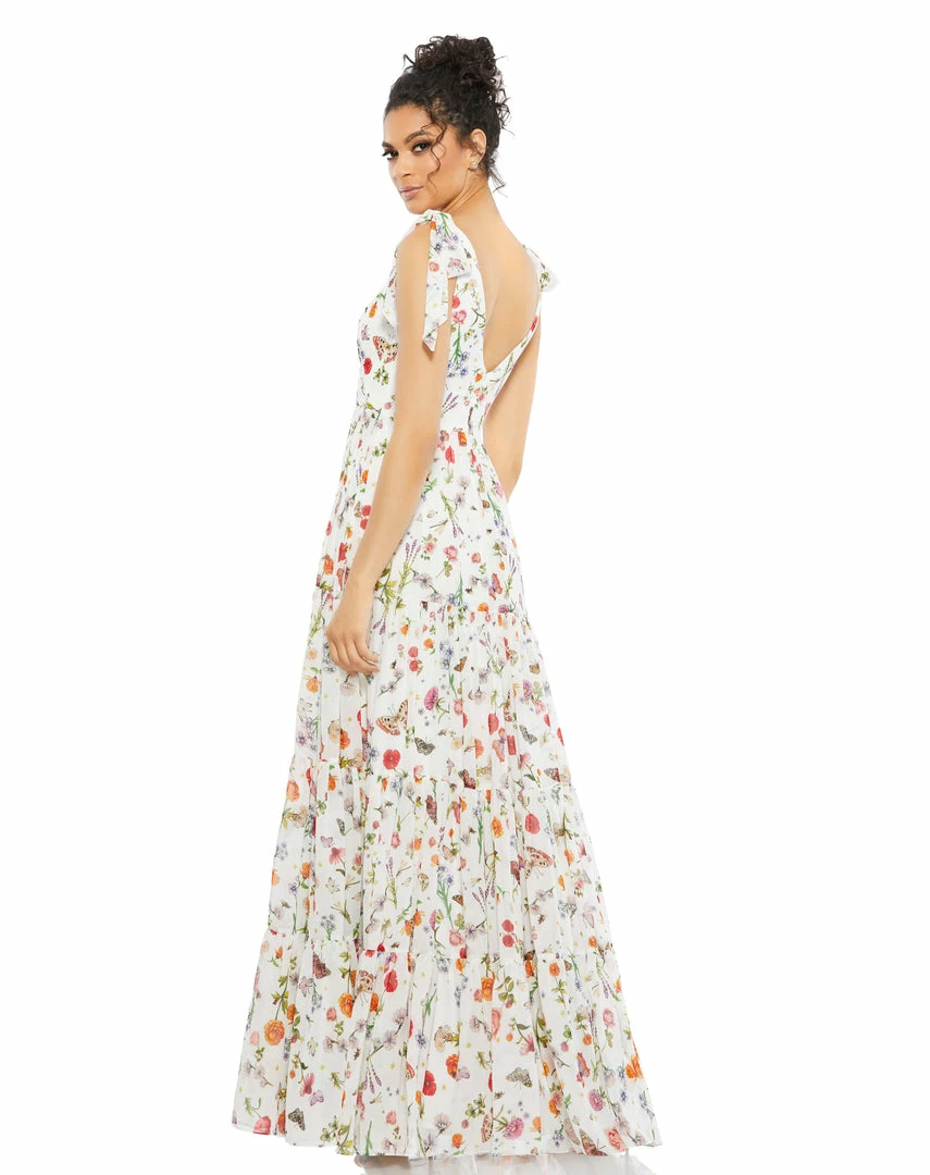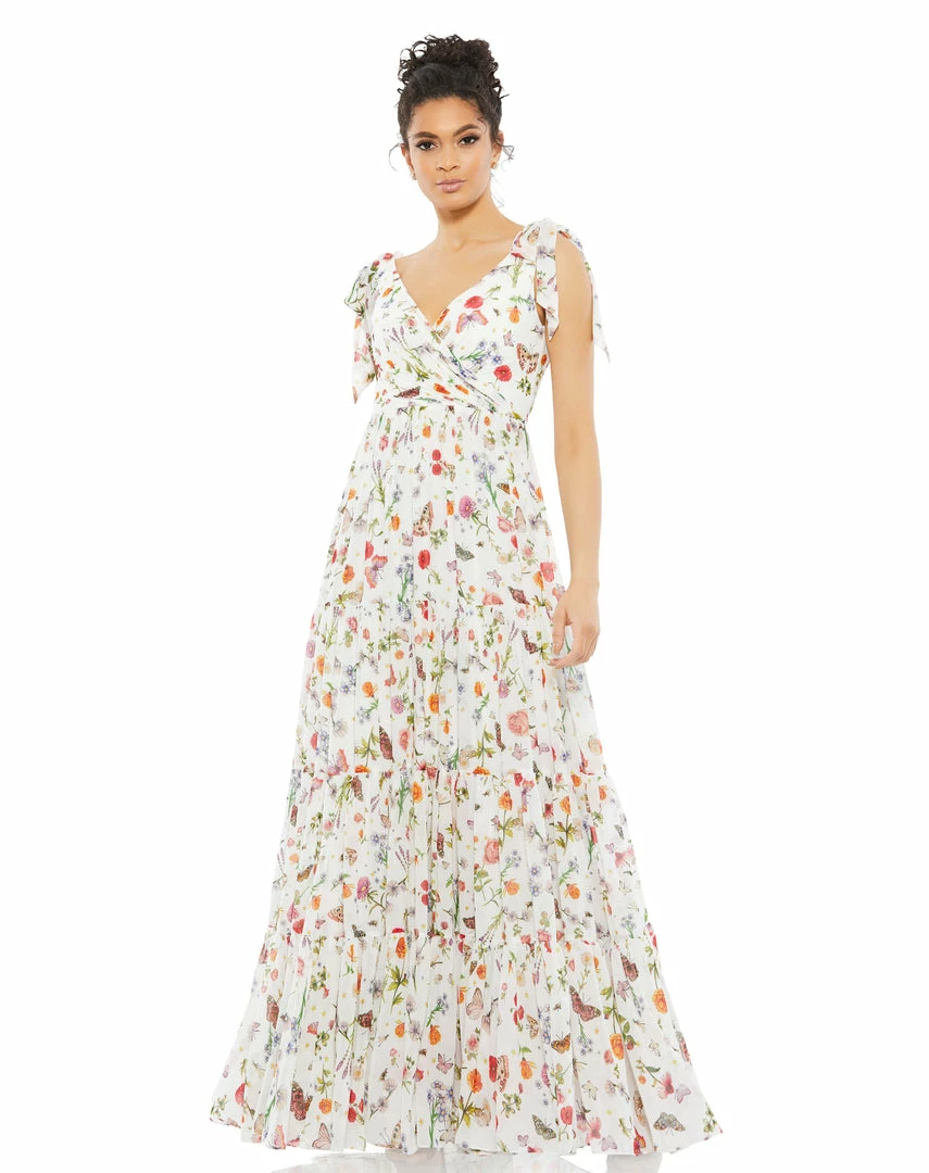 Beautiful butterfly and floral print maxi dress with a deep-v neckline, bow-tied straps, and a flowy tiered skirt.