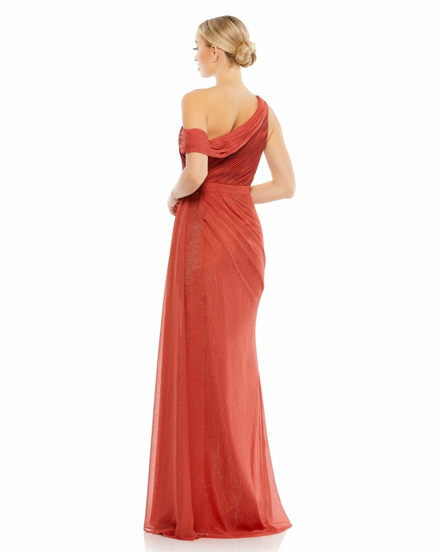 Sparkling one-shoulder draped evening gown with a thigh-high slit and accented natural waist.