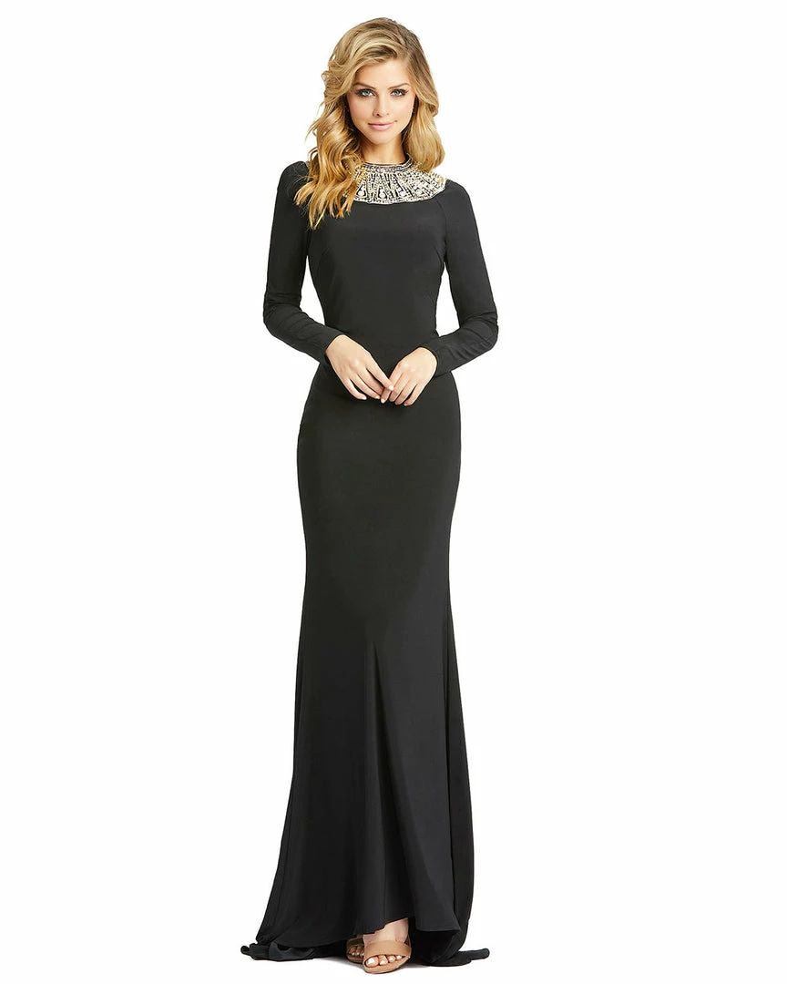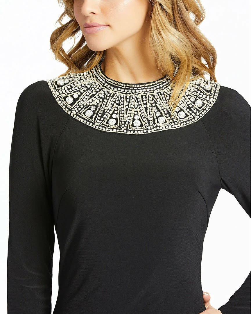 Full-length jersey gown with sequins, beading, and rhinestones lining the collar.