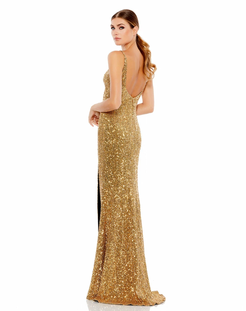 Sexy fully embellished sequin metallic gown finished with a thigh-high slit.