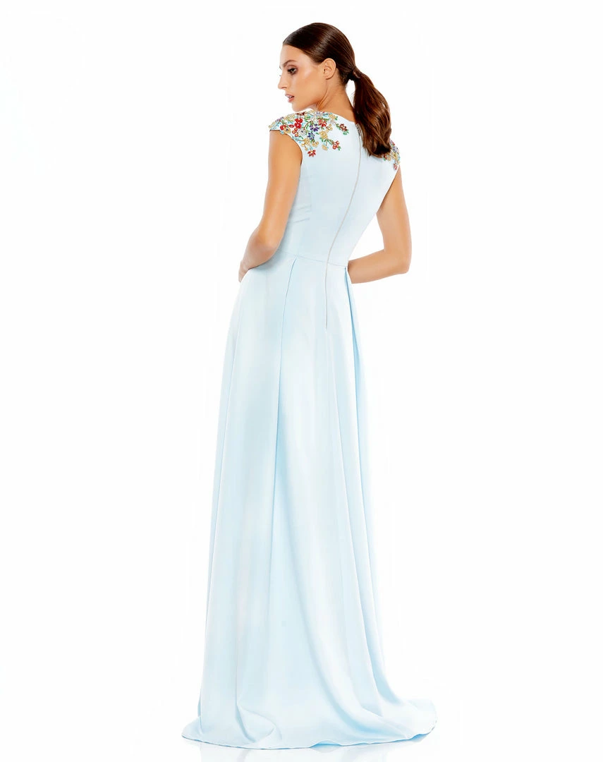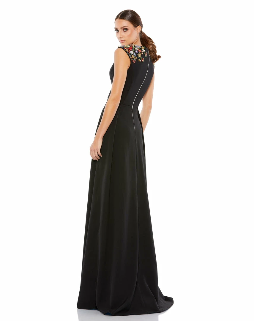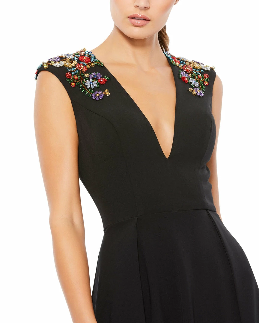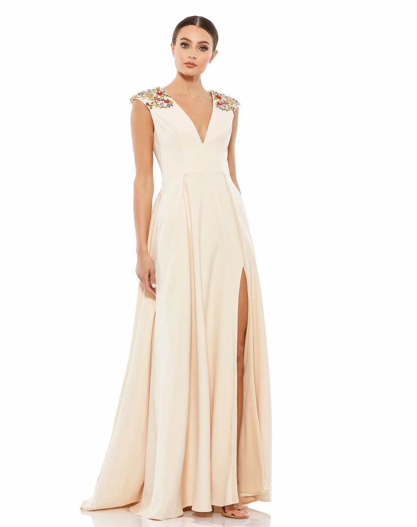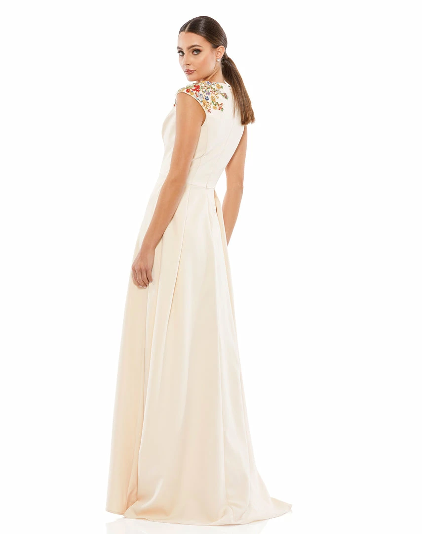 Elegant A-line gown accented with a plunging neckline and intricate bead-and-rhinestone floral accents across the shoulders and upper back.