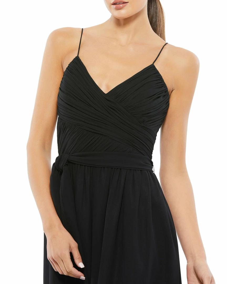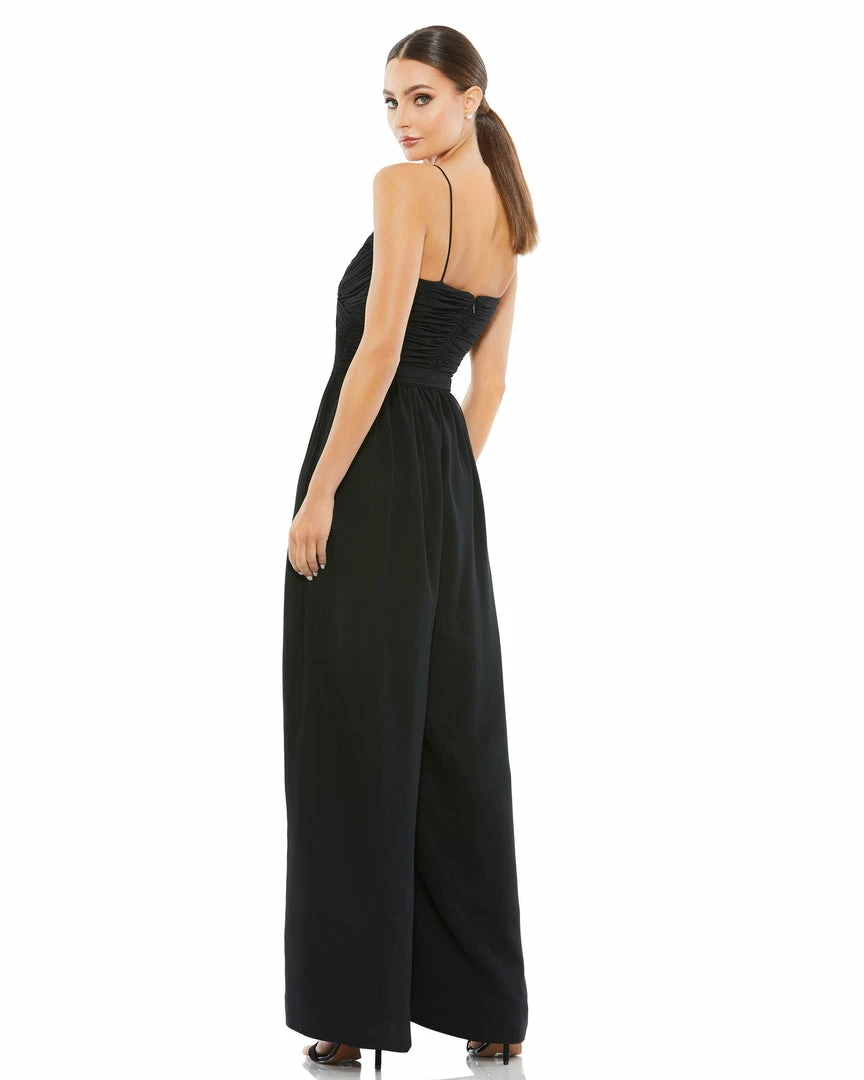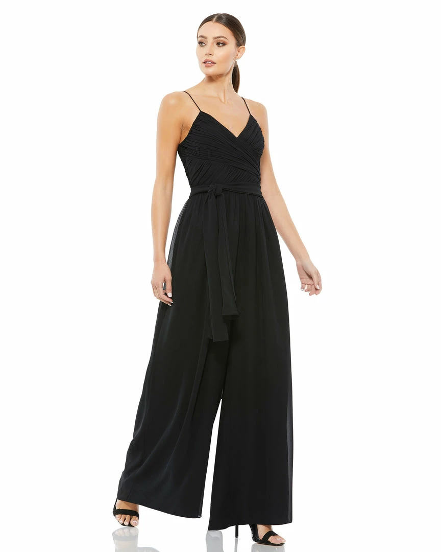Flowy white chiffon jumpsuit detailed with a cross ruched top and tie belt.