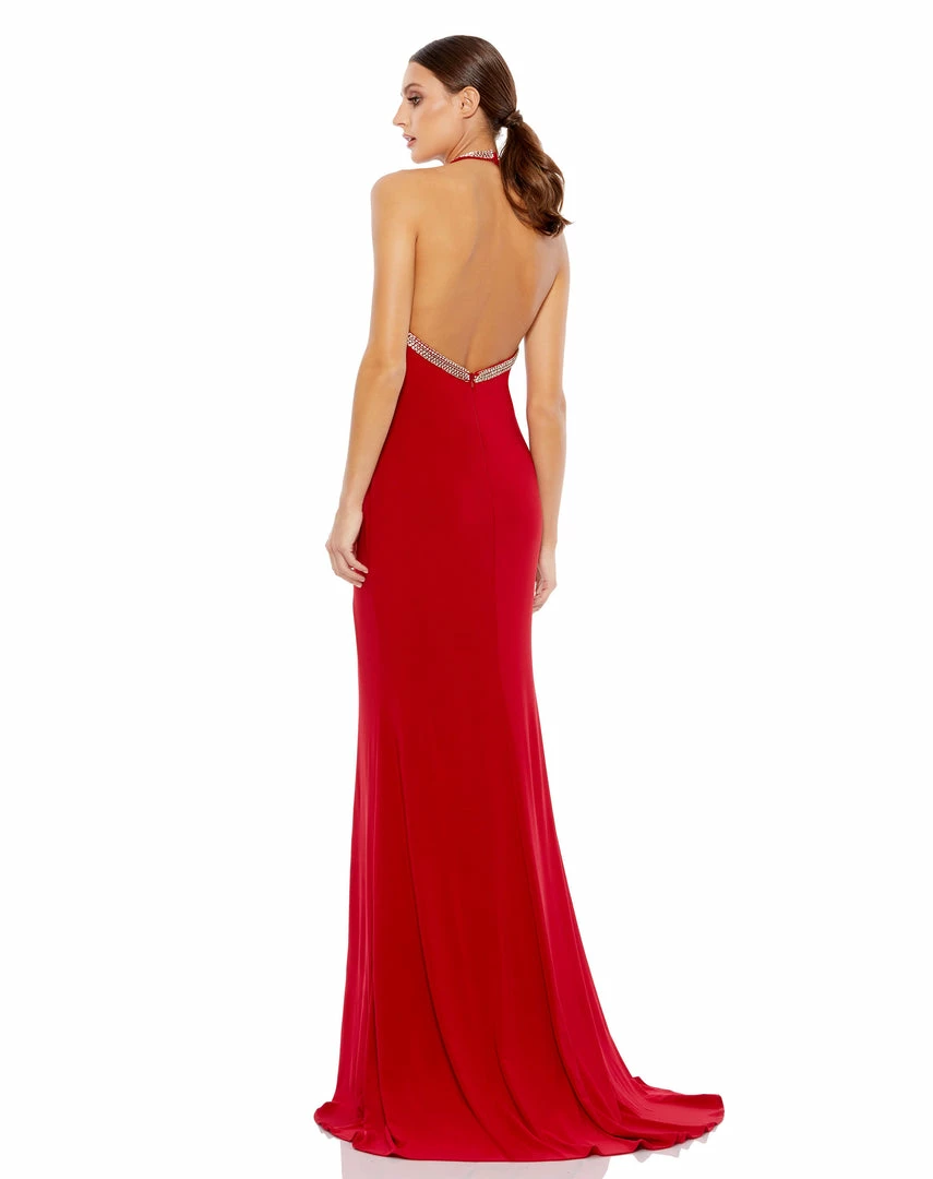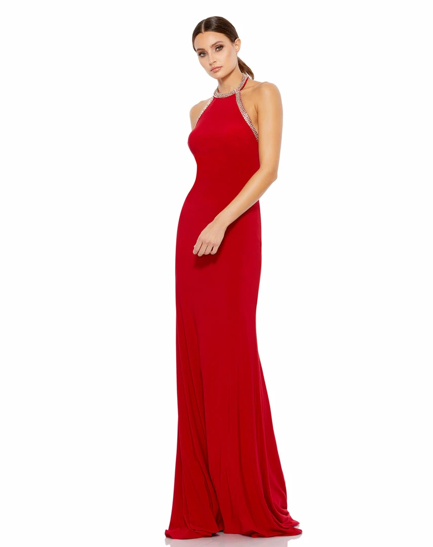 Stretch jersey halter gown accented with a rhinestone neckline and low back.