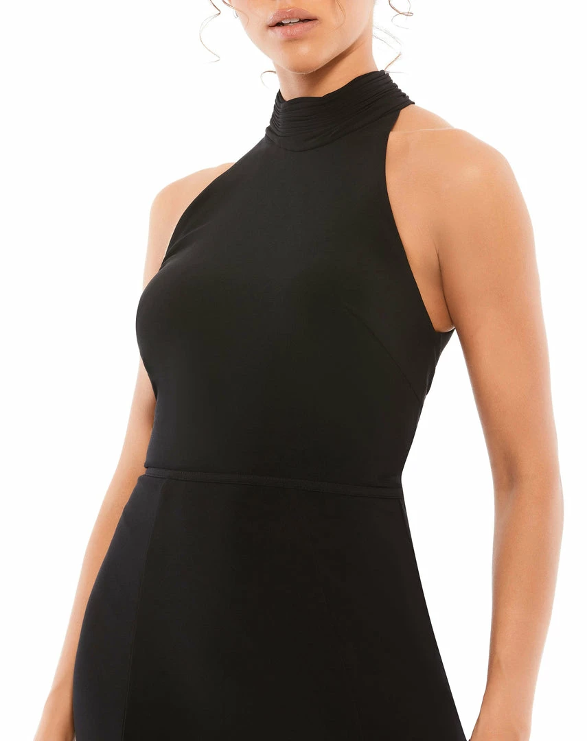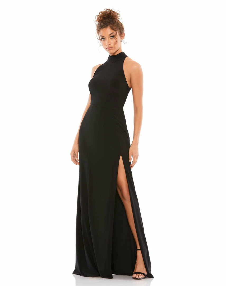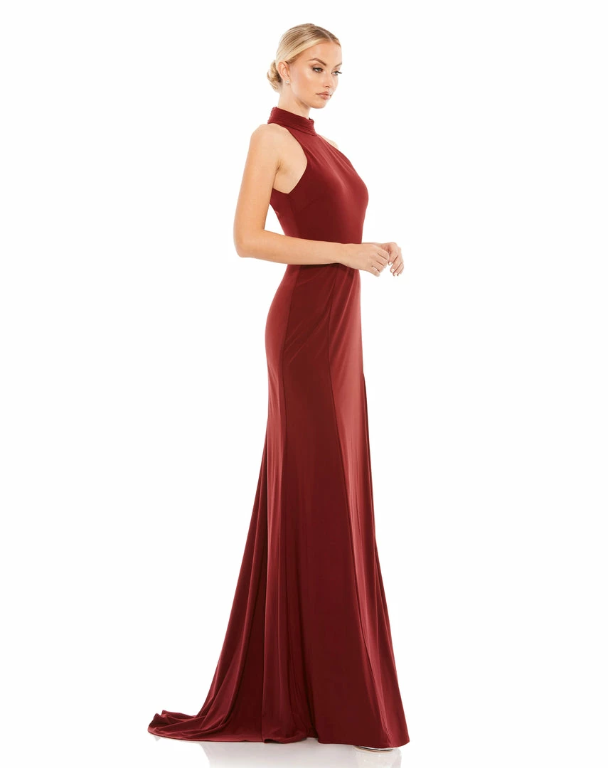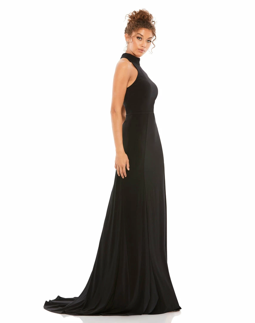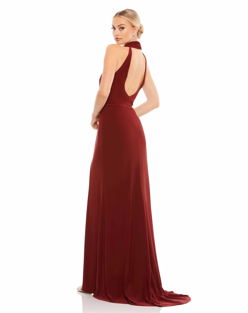 Elegant jersey gown featuring a front slit, teardrop-shaped back cutout, and puddle train.