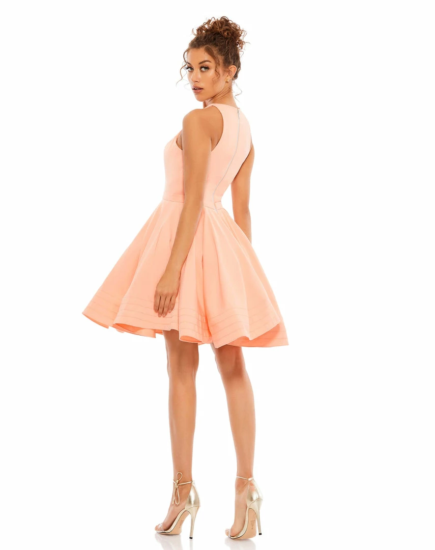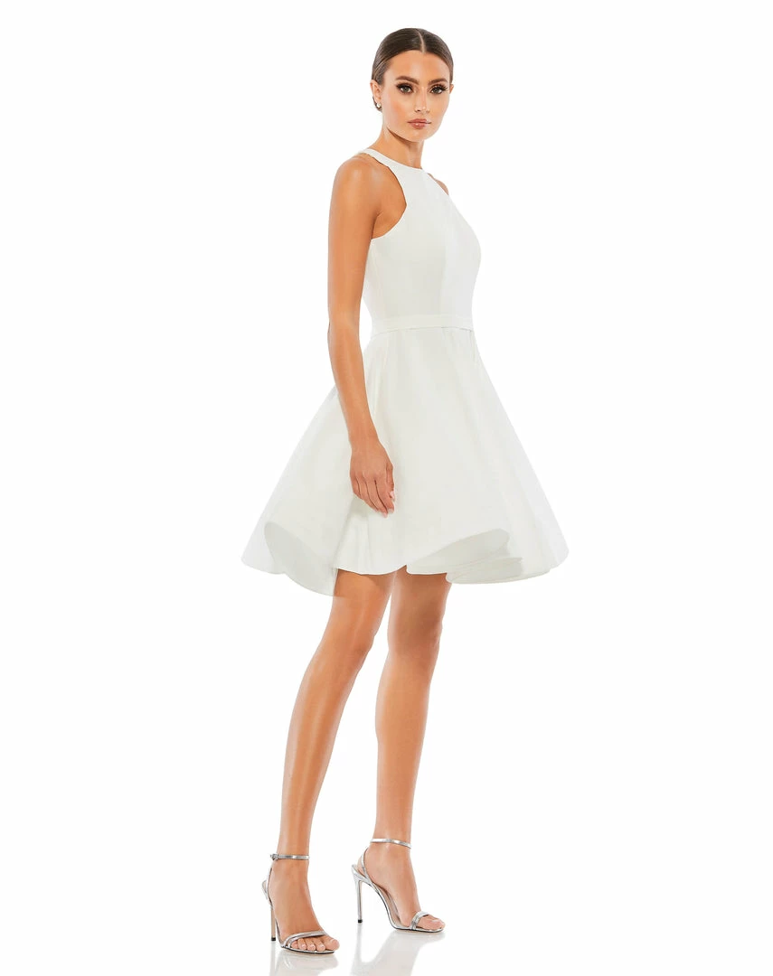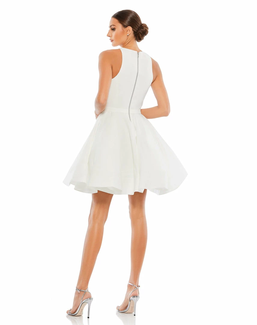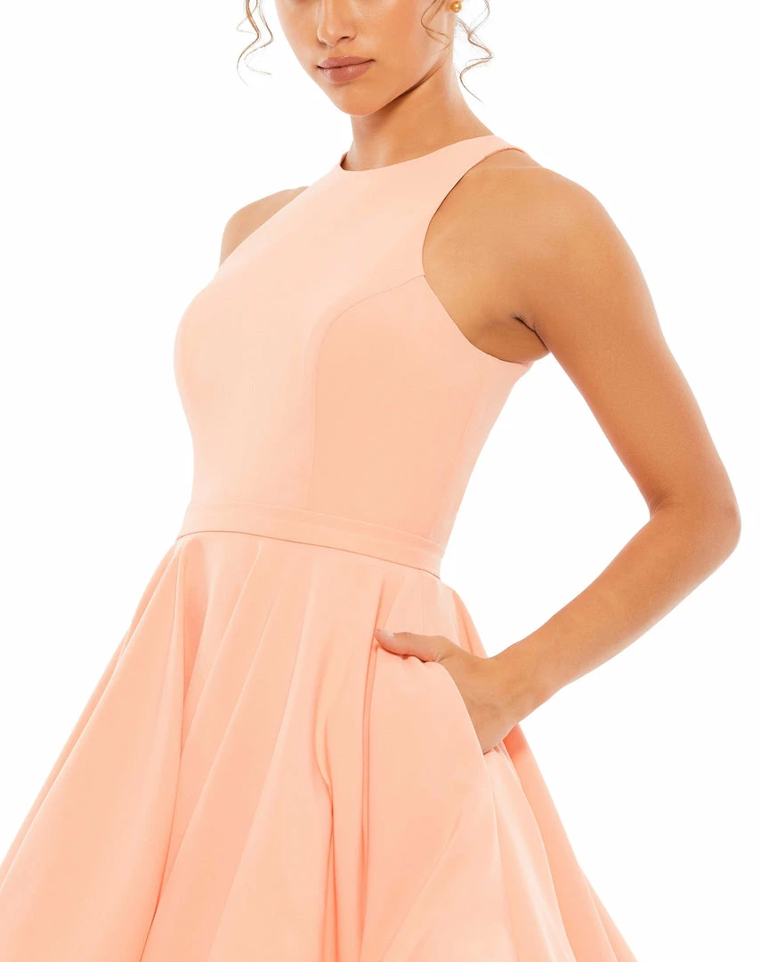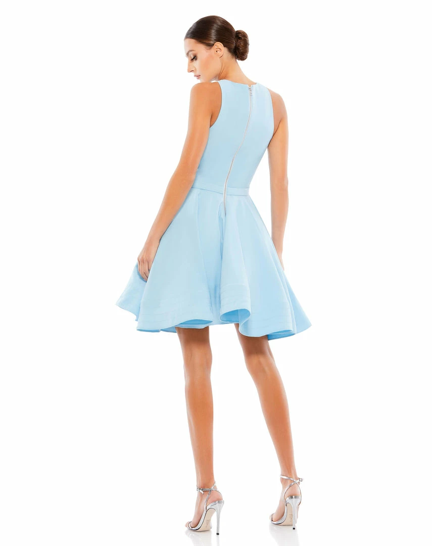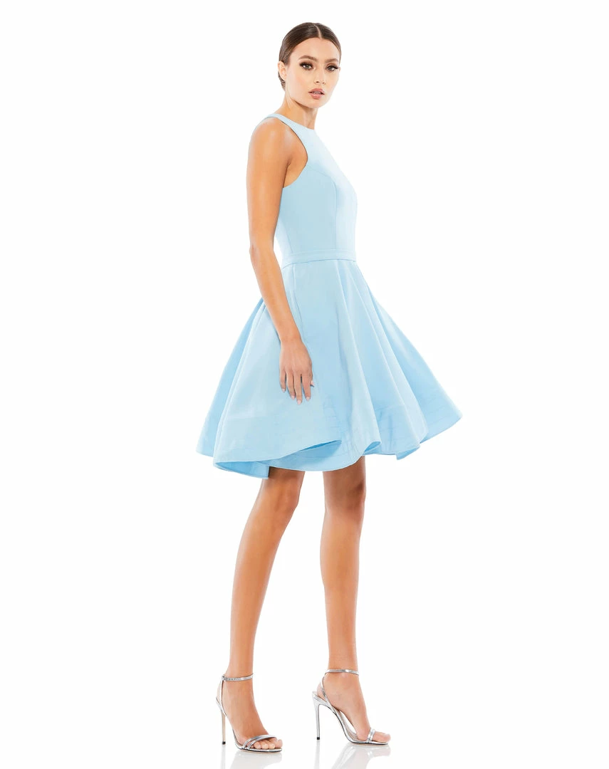 Flirty fit-and-flare skater dress with a high neckline and pockets.
