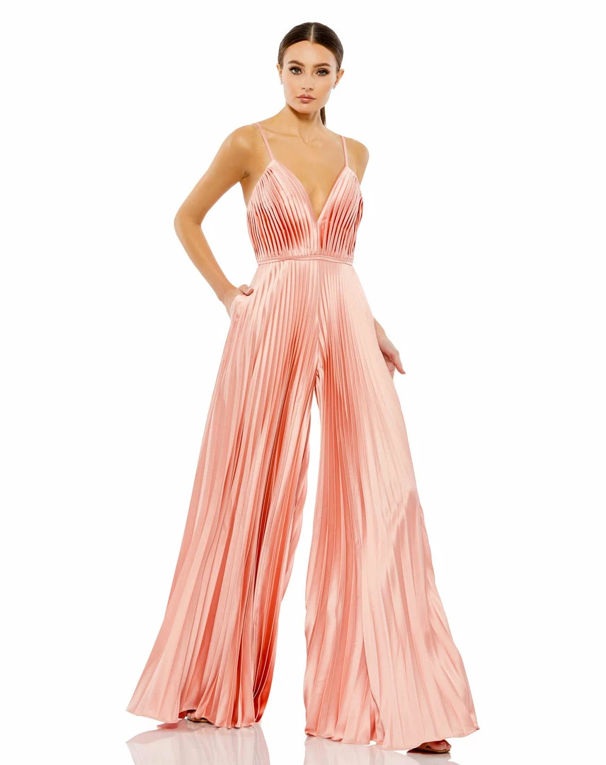 Fully-pleated wide leg jumpsuit in a beautiful silky charmeuse fabric and functional pockets.
