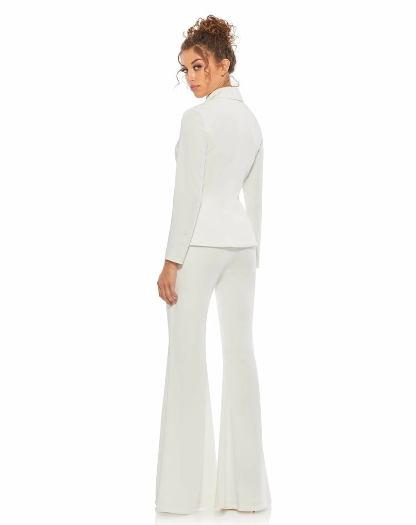 Sexy and feminine two-piece suit with a fitted blazer, deep v-neck, front flap pockets, and a single bejeweled snap button. Full-length pants are fitted through the hip and thigh with a wide flare from the knee down.