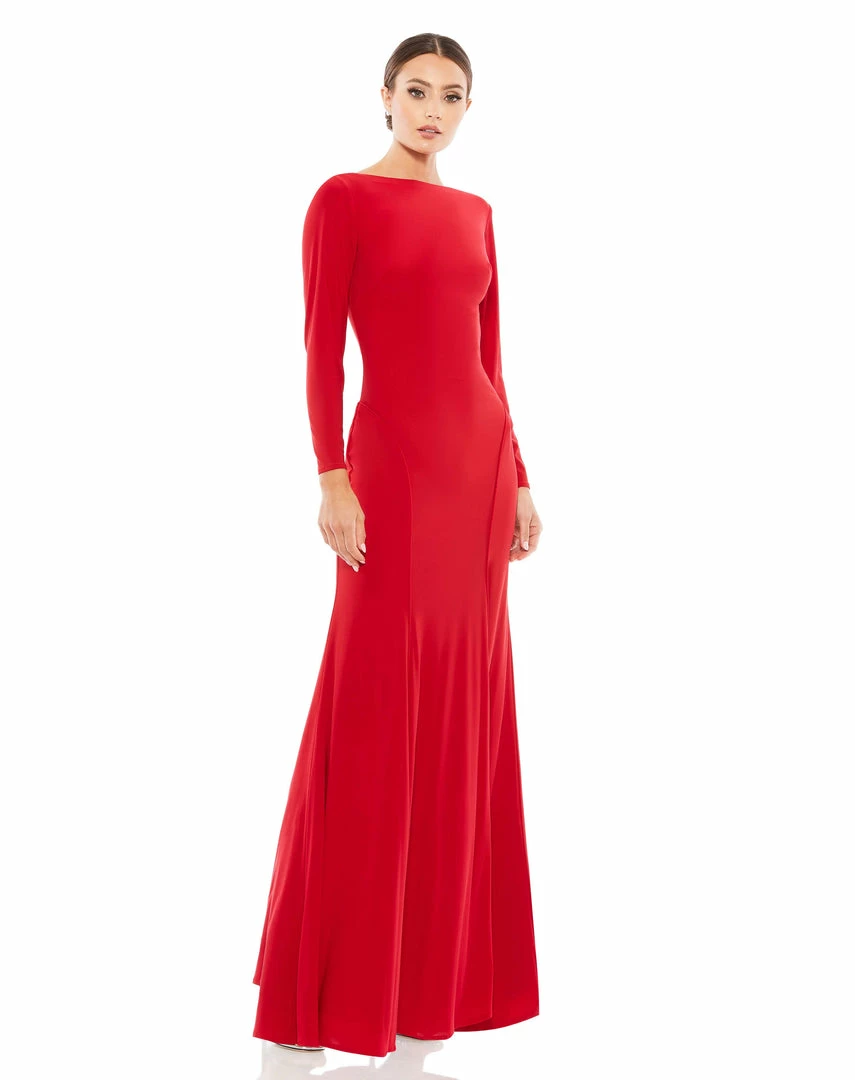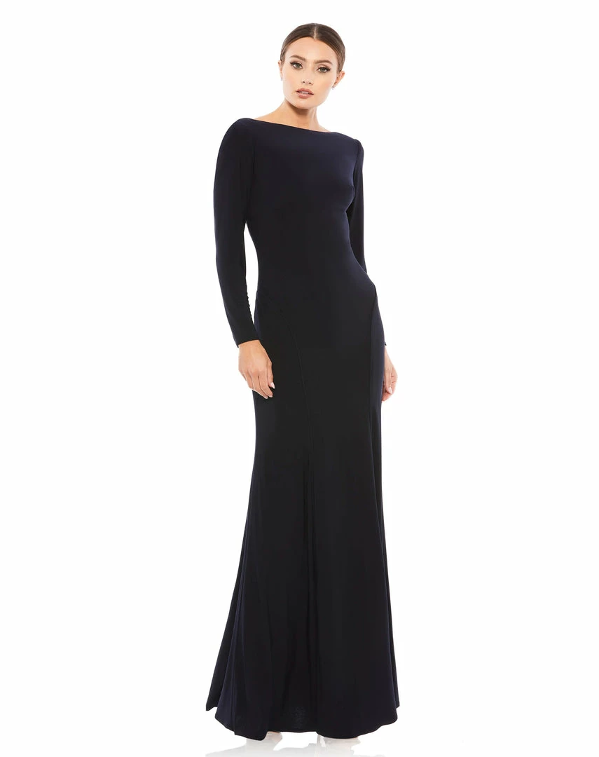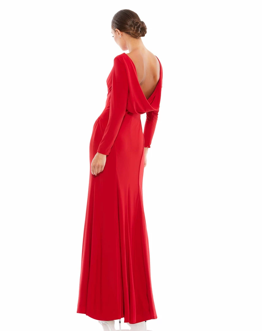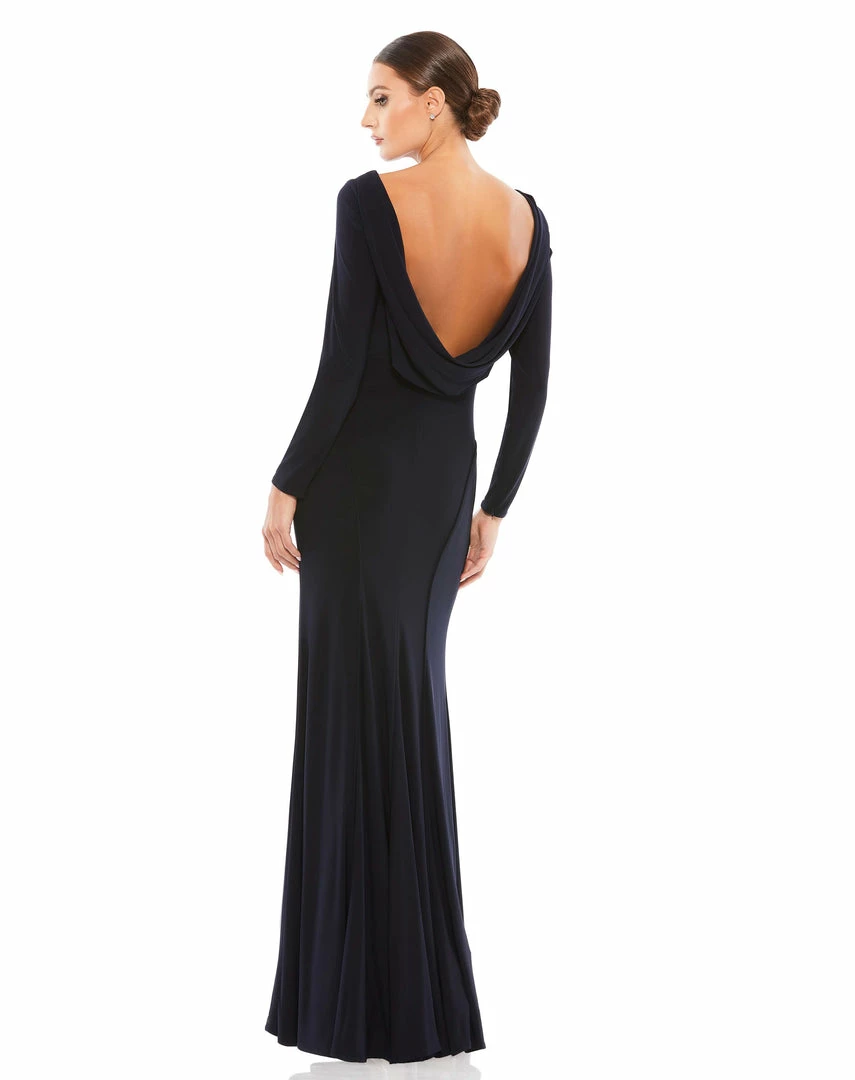 Stunning long-sleeve jersey gown accented with a dramatic cowl back.