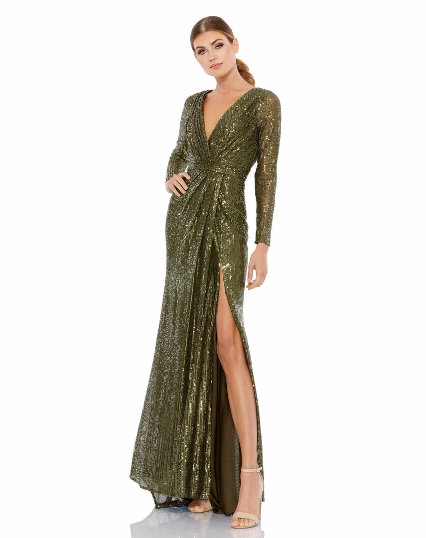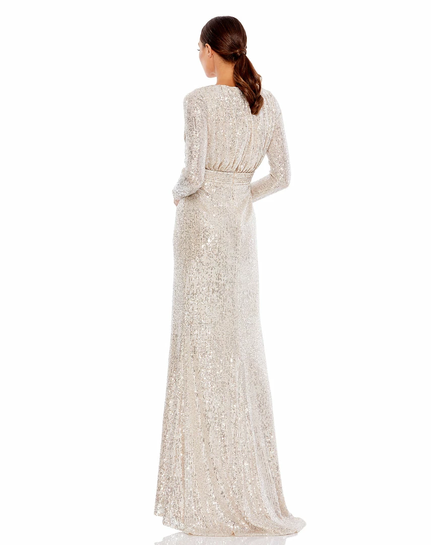 Long sleeved fully sequined evening gown accented with a ruched waist and thigh-high front slit.