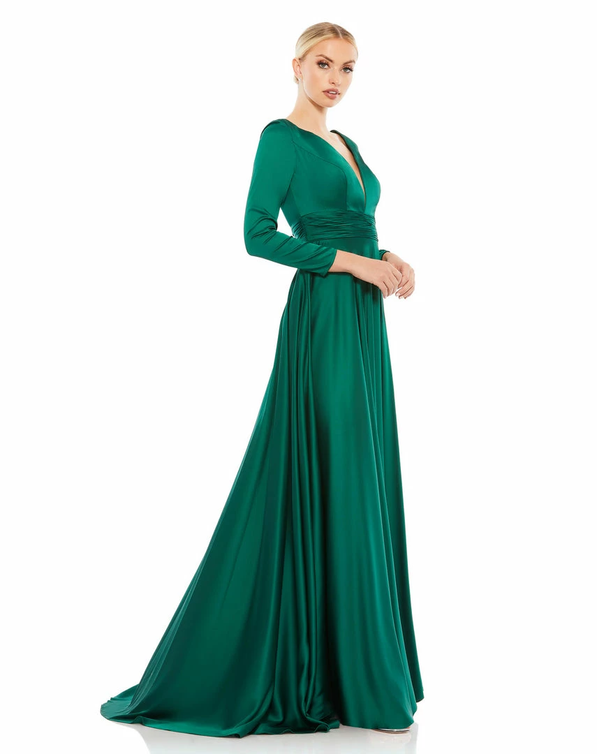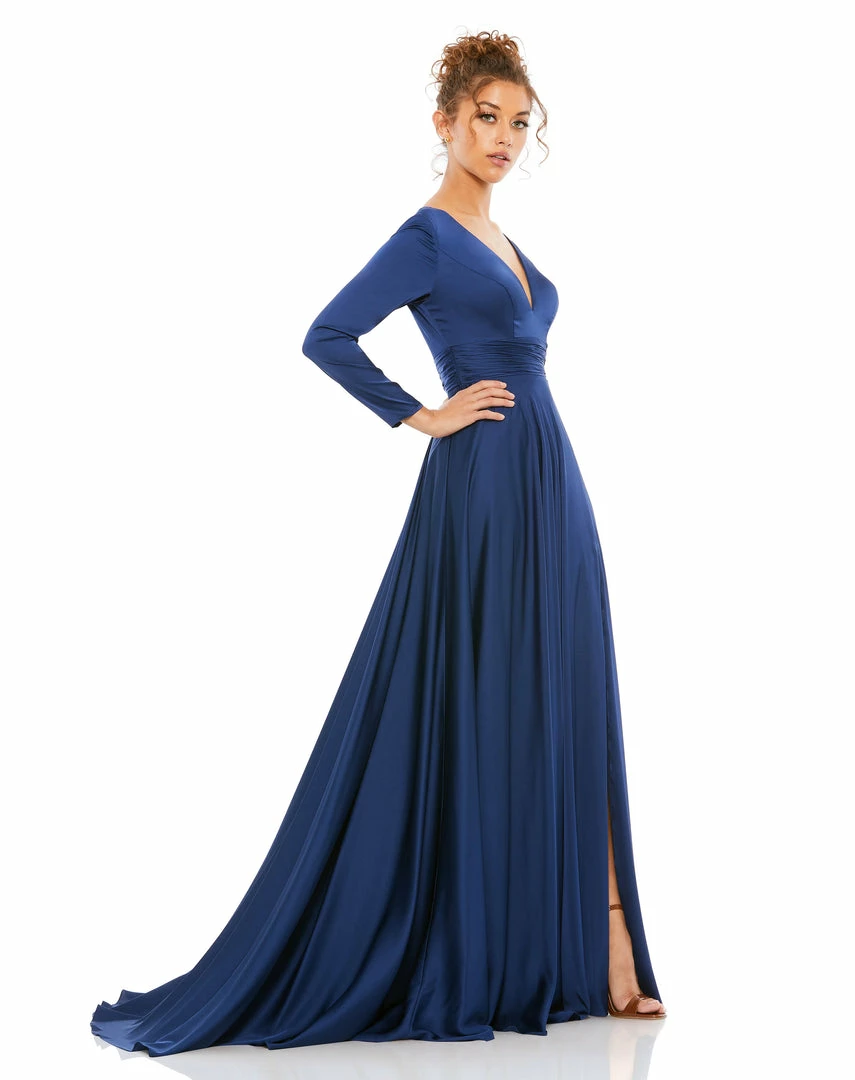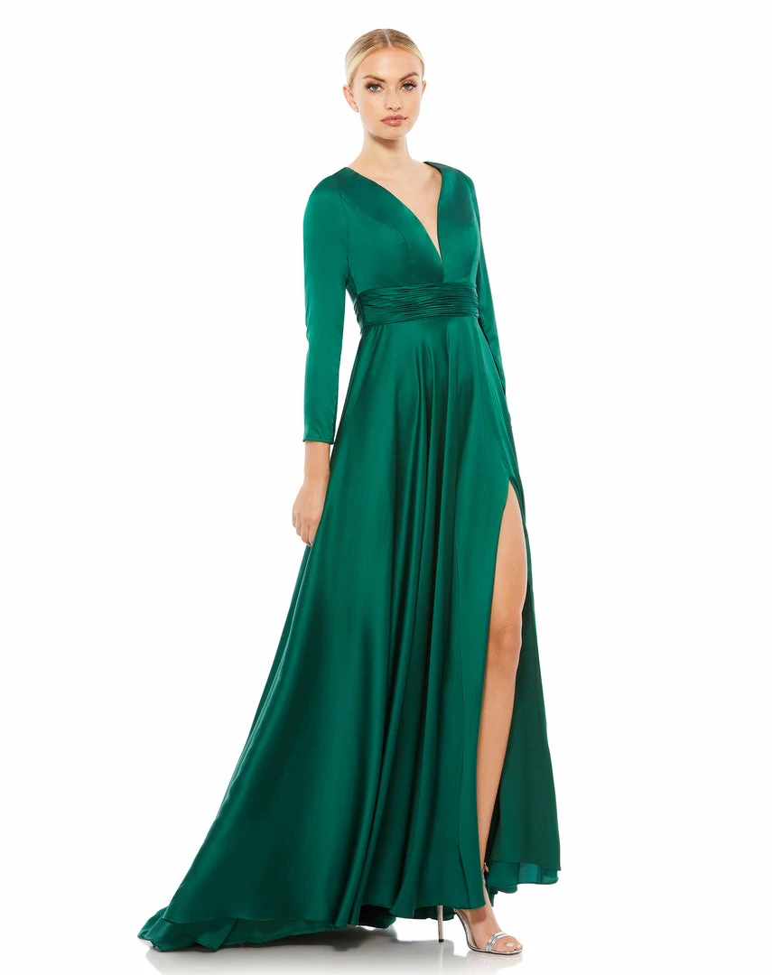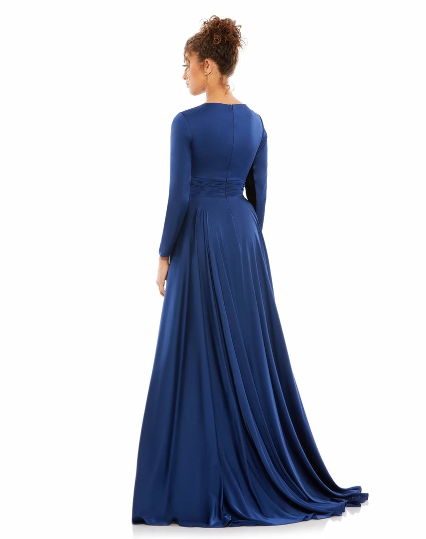 Long sleeve satin a-line gown accented with a ruched belt, a thigh slit, and a sweeping train.