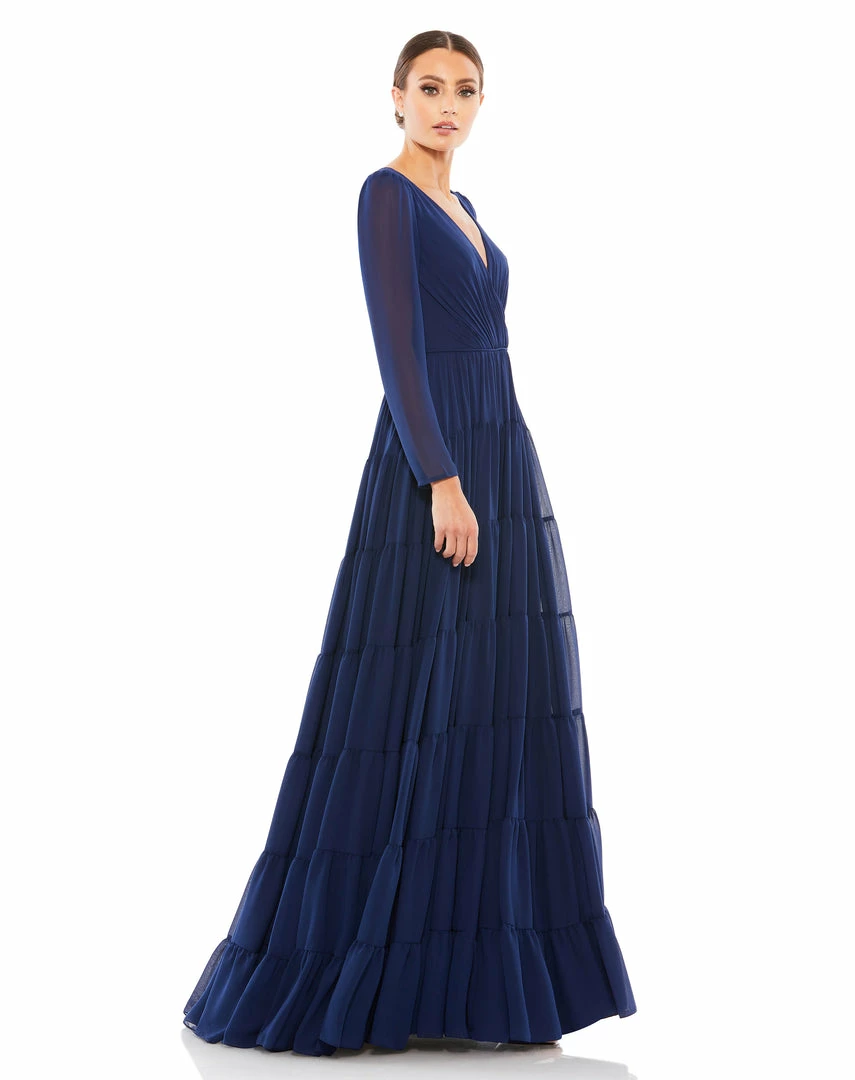 Elegant evening gown with a v-neckline, enchanting long-sleeves, and a tiered flowy ruffle skirt.