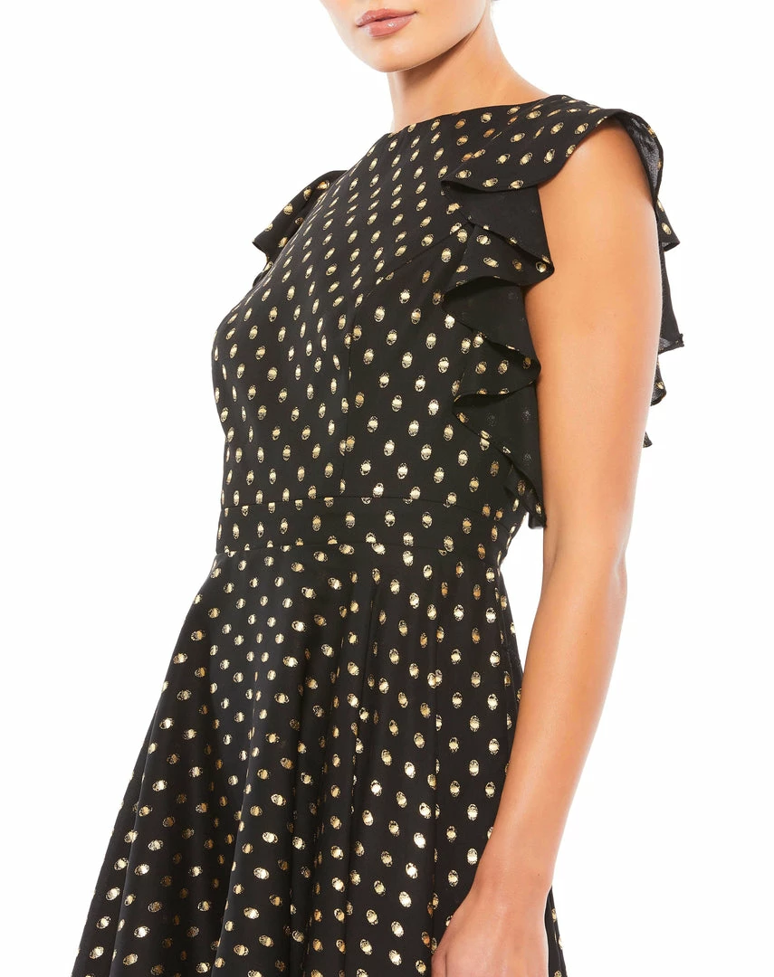 Cute black-and-gold polkadot printed mini dress with a layered skirt and flutter sleeves.
