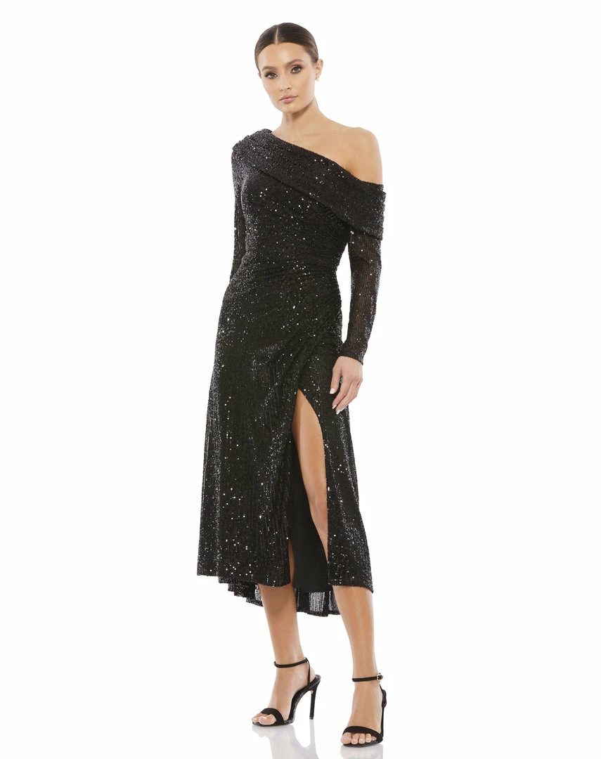 One shoulder long sleeve sequin midi dress with a slit.