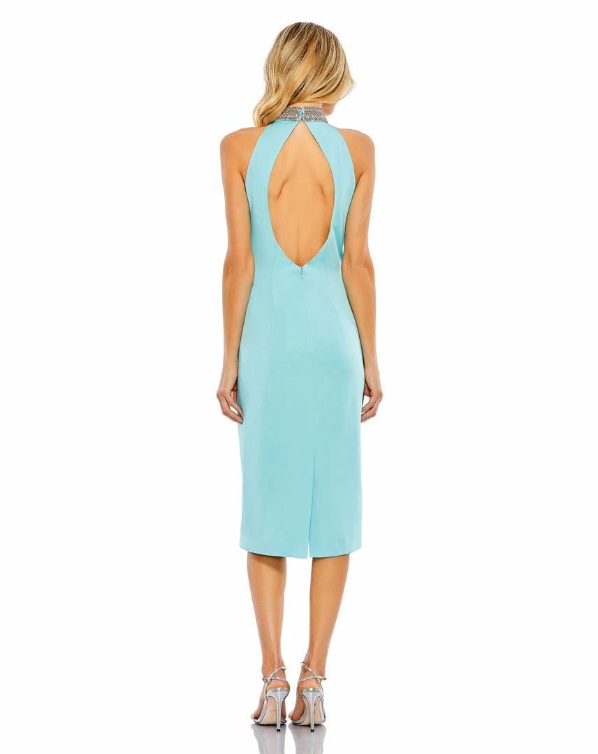Ieena For Mac Duggal Open Back Jeweled Halter Midi Dress