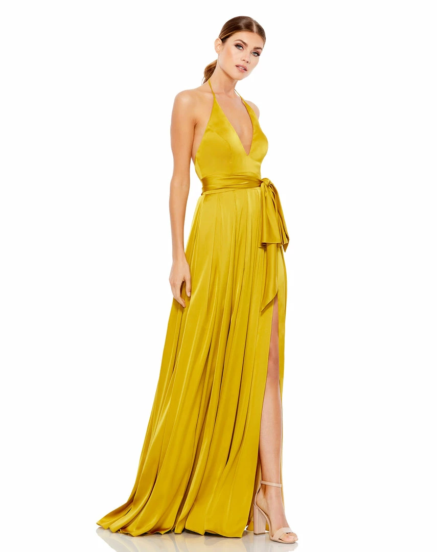 Satin charmeuse halter gown with a plunging v-neckline, sexy open back, a self-tie belted waist, and a floor-length box pleated skirt with a thigh-high slit and sweeping train.