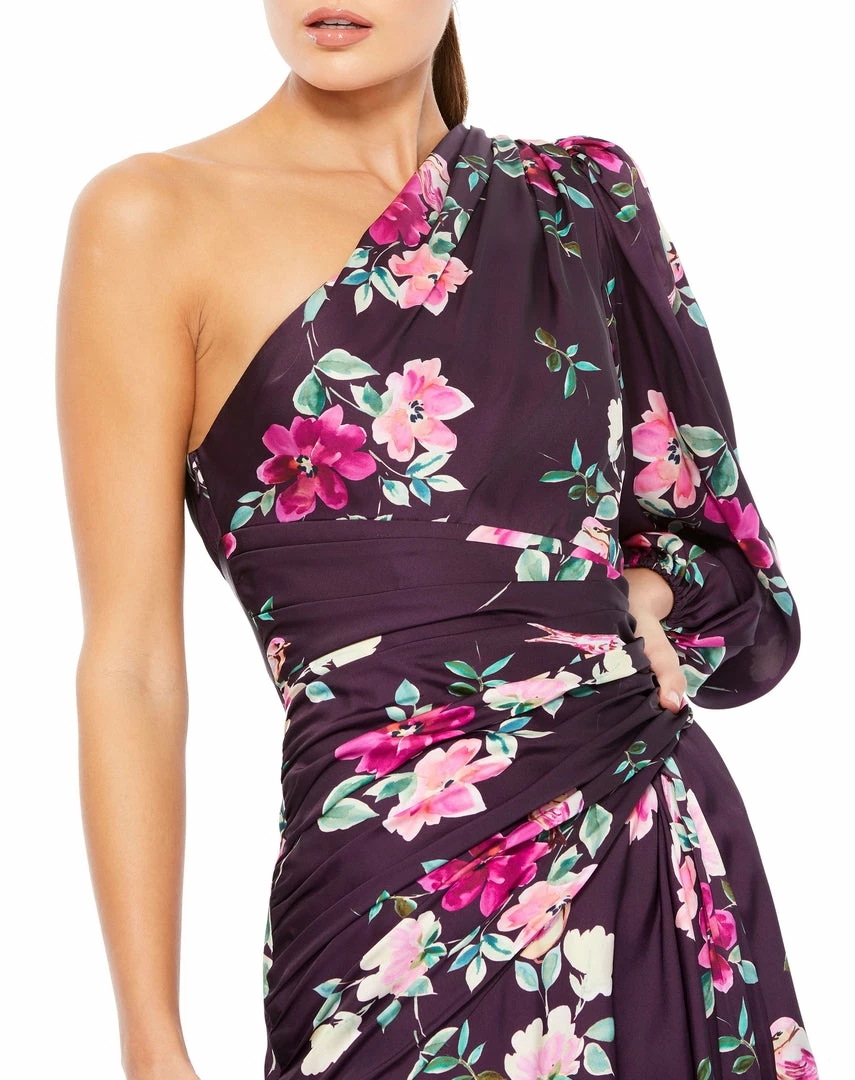 One-sleeve charmeuse floral-print gown completed with a high slit and hand-sewn ruching to accent the waist.