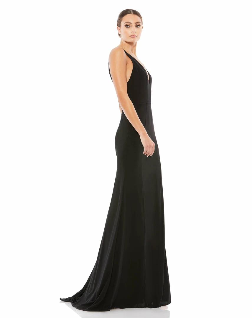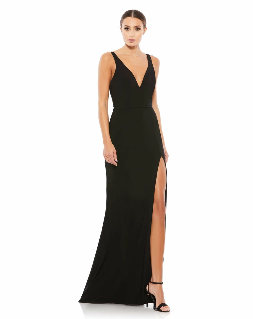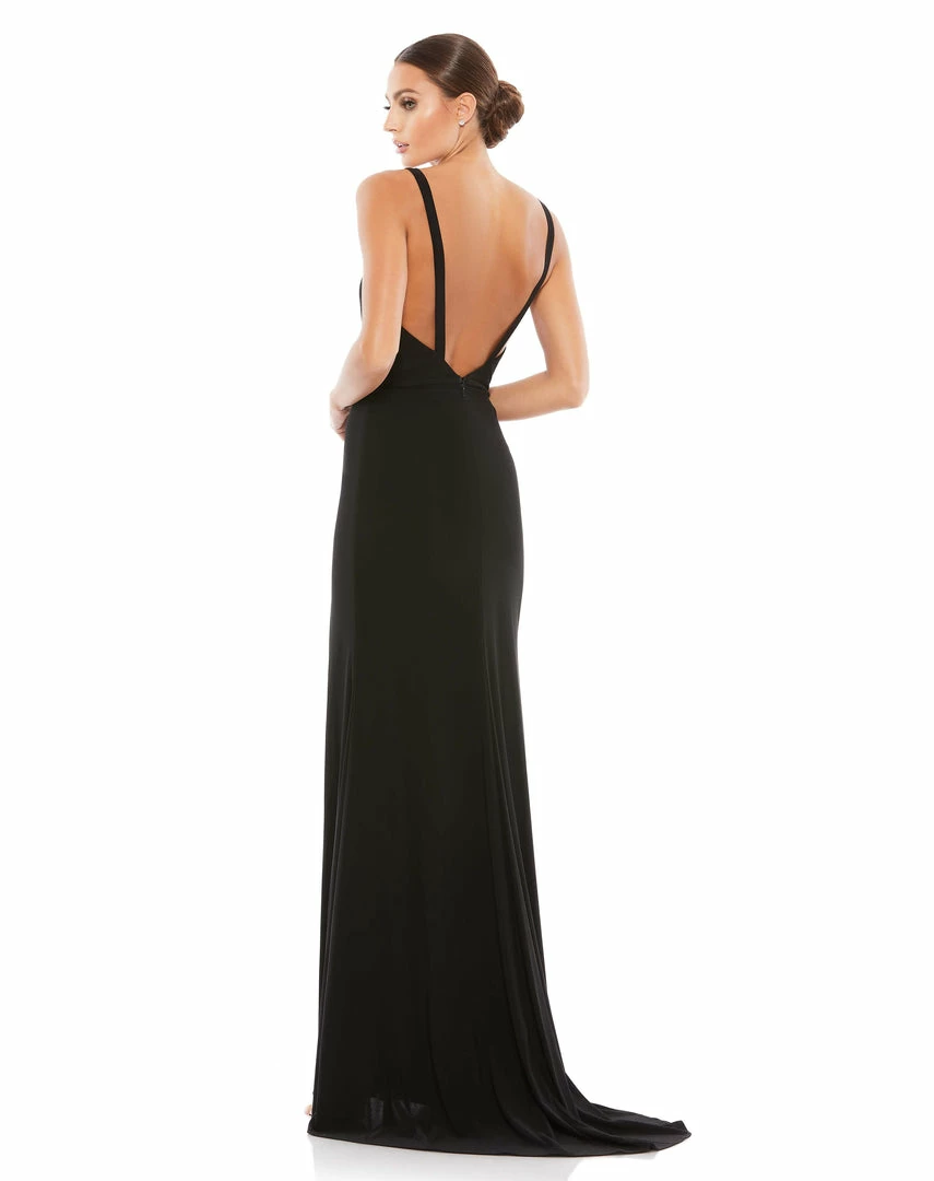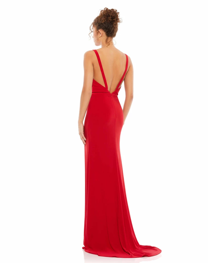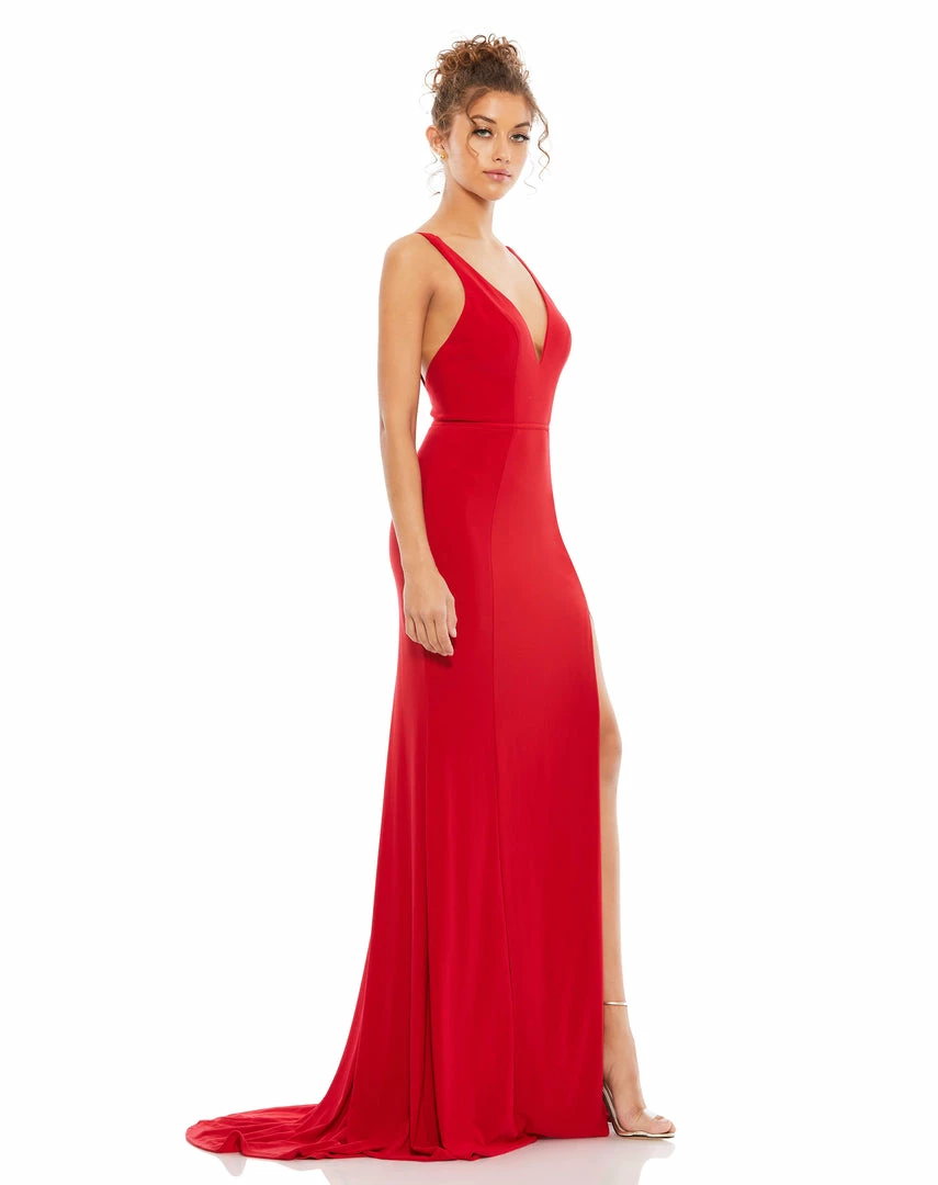 Classic plunge neck gown with low back and thigh-high slit.