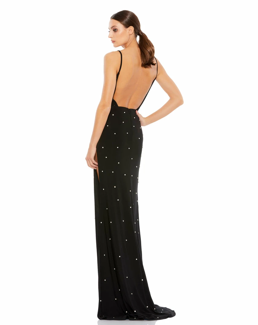 Spaghetti-strap stretch jersey gown with allover rhinestone accents, a thigh-high slit, and sexy open back.