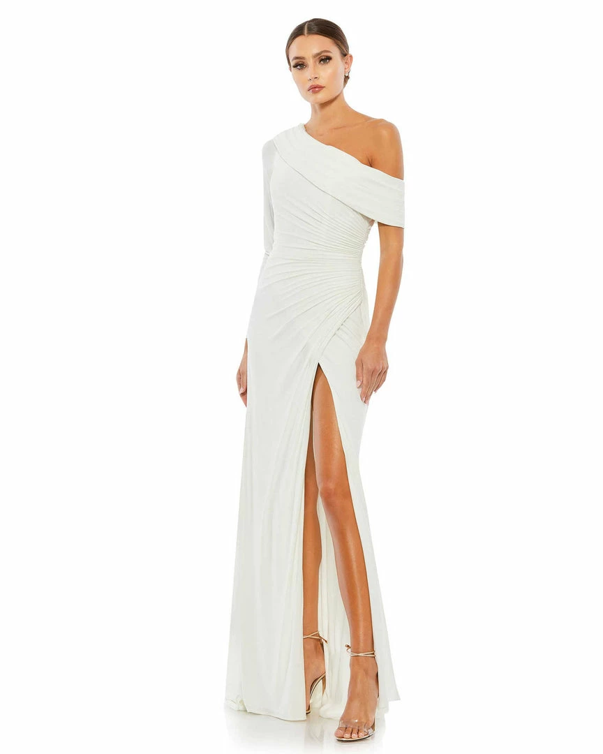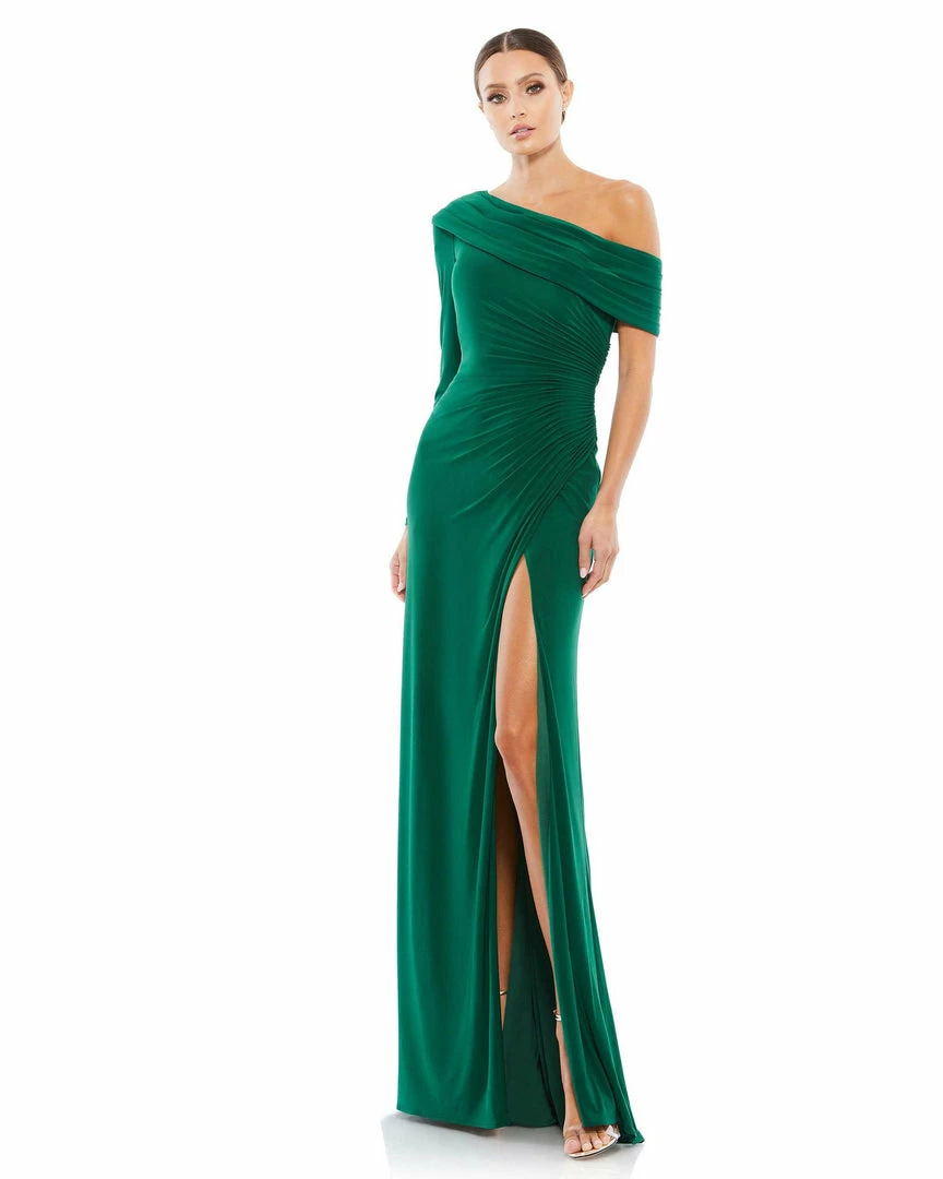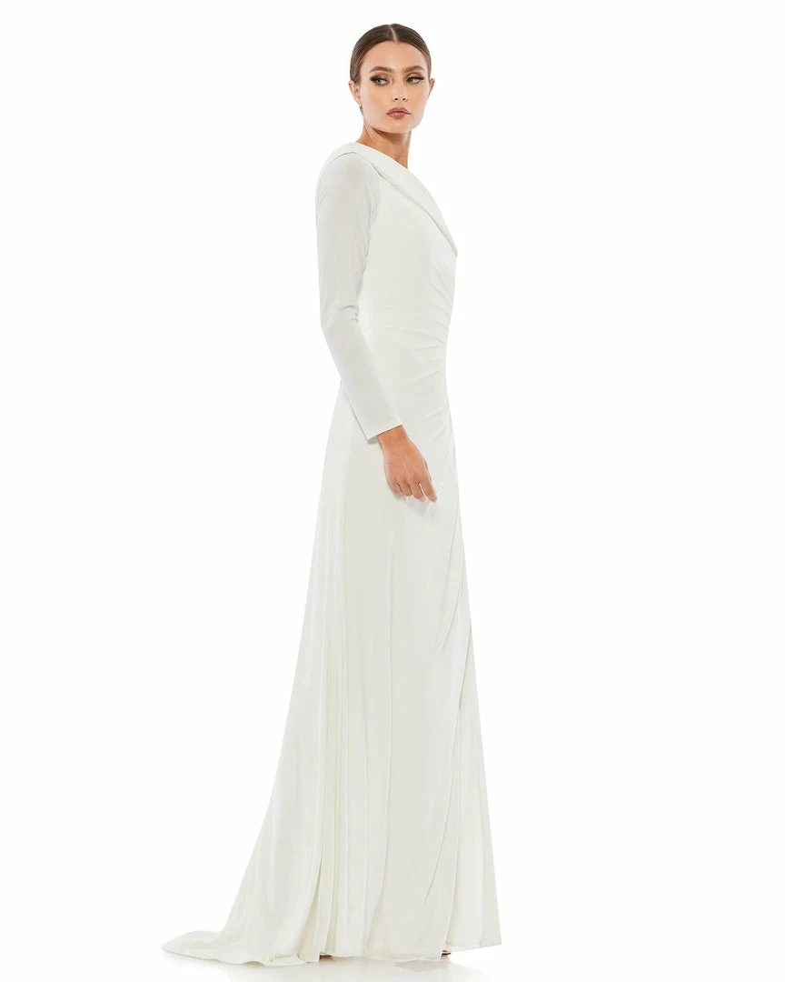 Ieena For Mac Duggal Ruched Jersey Drop Shoulder Foldover Gown