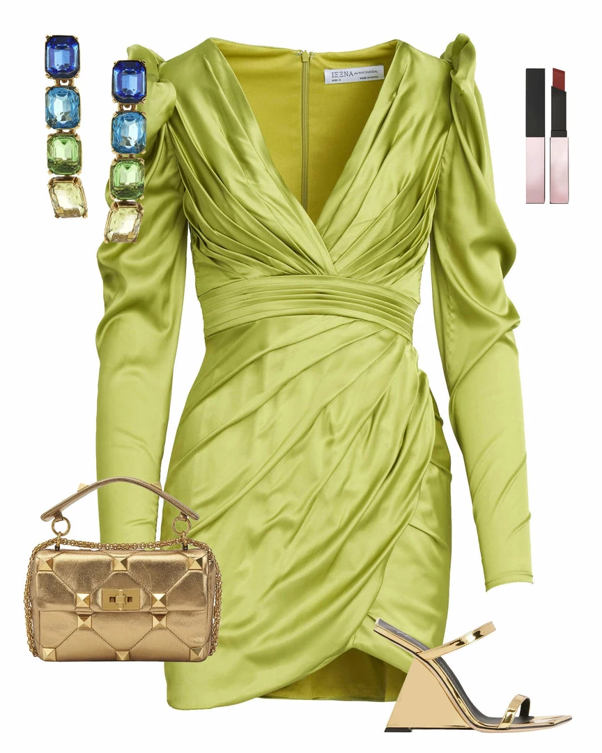 Sexy satin mini cocktail dress accented with dramatic puffed sleeves. This dress features a diagonal pleating across the bodice and skirt, and the waist is accented with a horizontal pleated waistband.