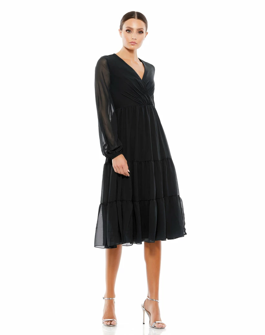 Ieena For Mac Duggal Ruched V-Neck Tiered Midi Dress