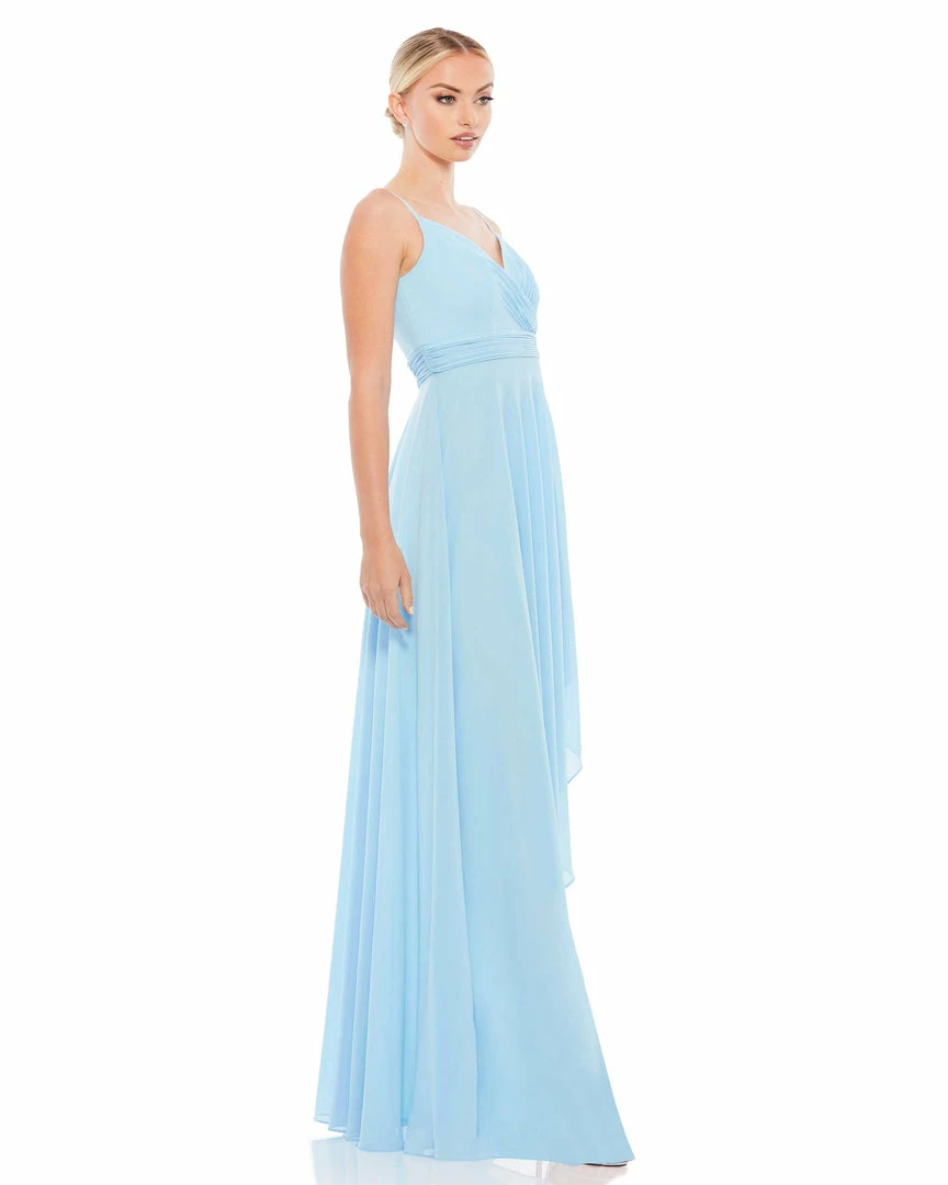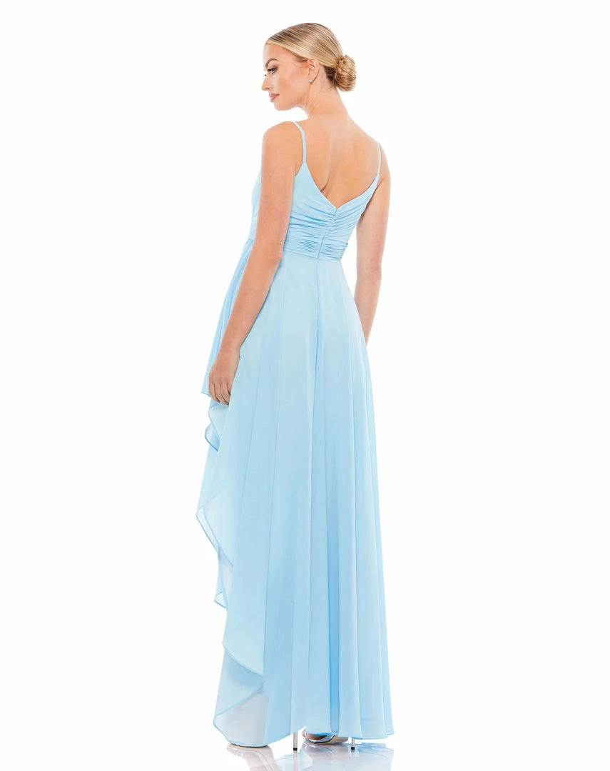 Sleeveless chiffon maxi dress with ruched faux-wrap v-neckline, spaghetti straps, and a flowy asymmetrical hi-low ruffle hem.