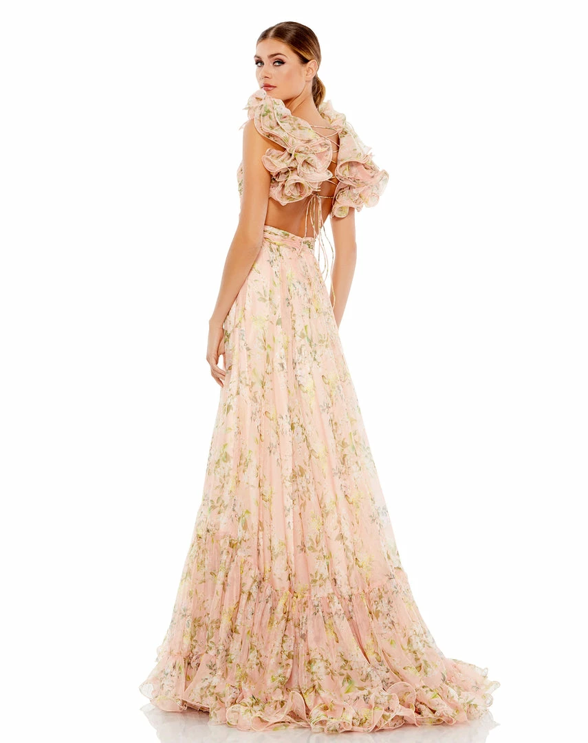 Gorgeous chiffon maxi dress with cut-out sides and back, pleated bodice, and a sexy lace-up open back. Dramatic ruffles accent the shoulders, and a flowy tiered skirt completes the look.