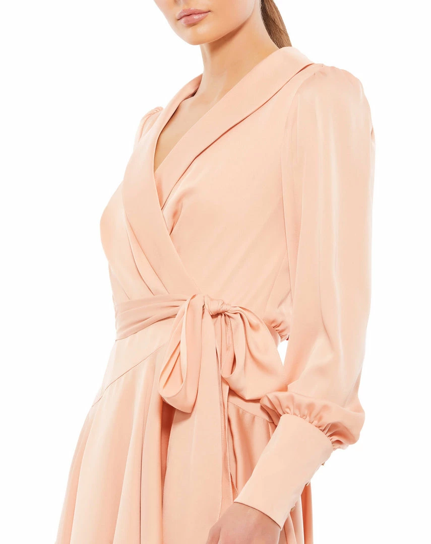 Chic long-sleeved wrap dress with a shawl lapel and flirty pleated hi-low skirt.