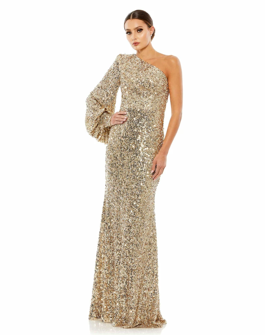 Ieena For Mac Duggal Sequined One Shoulder Bishop Sleeve Trumpet Gown