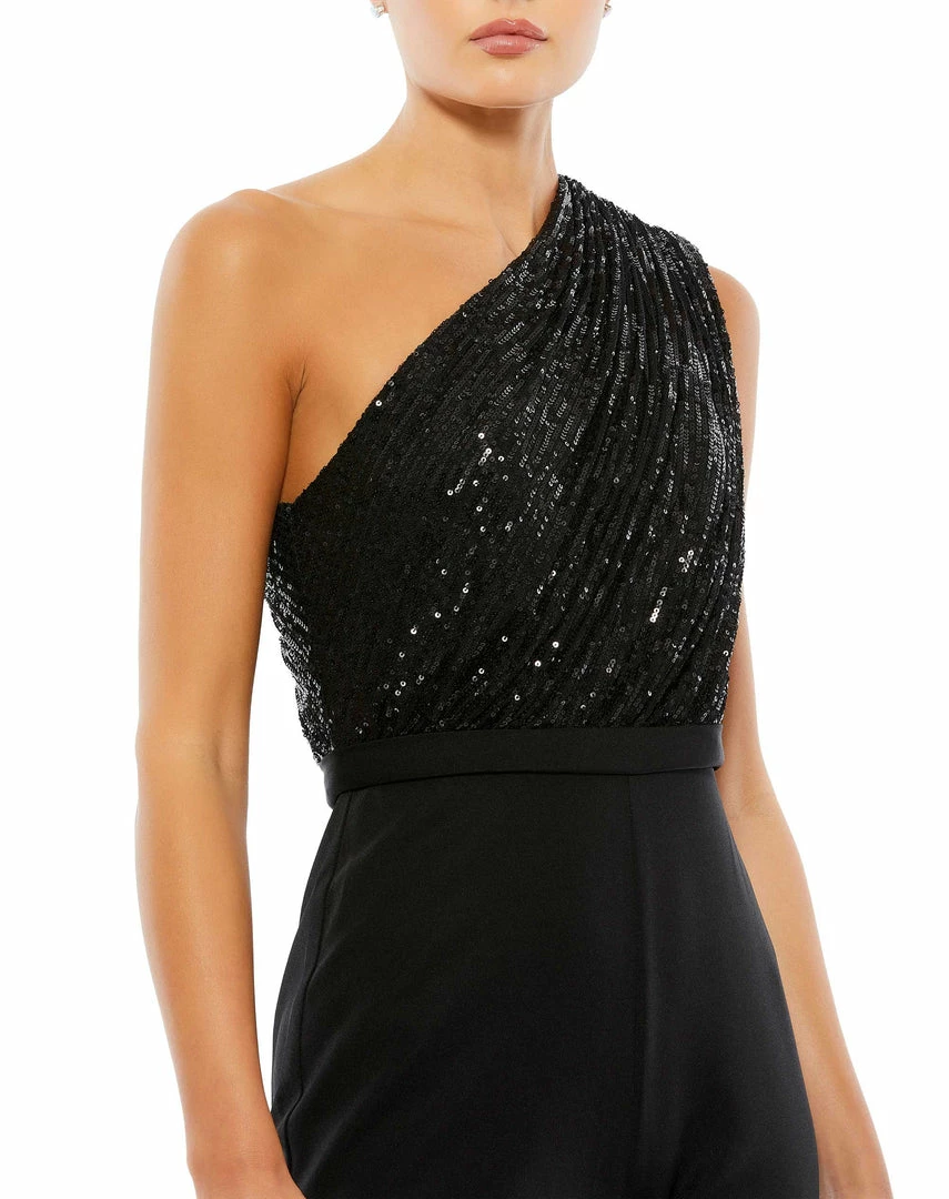 A fashion-forward alternative to a party dress, this one-and-done jumpsuit is the perfect way to mix up your evening attire. The jumpsuit is designed with a sequin-covered one-shoulder bodice, retro bell-bottom pants, and a slender set-on waistband that pulls the piece together. A sophisticated way to sparkle all night long.