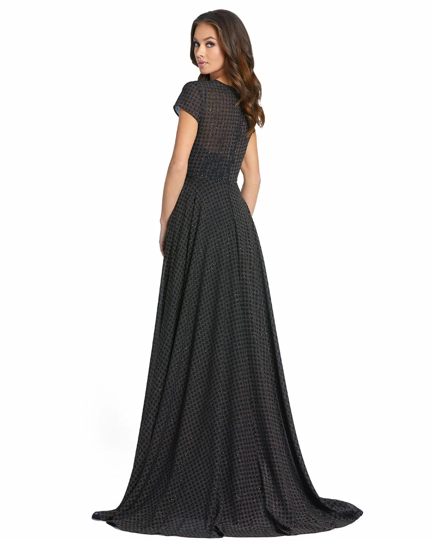 Black & gold A-line evening gown with short sleeves, a semi-sheer bodice, and sweeping train. The floor-length skirt features a waist-high side slit.