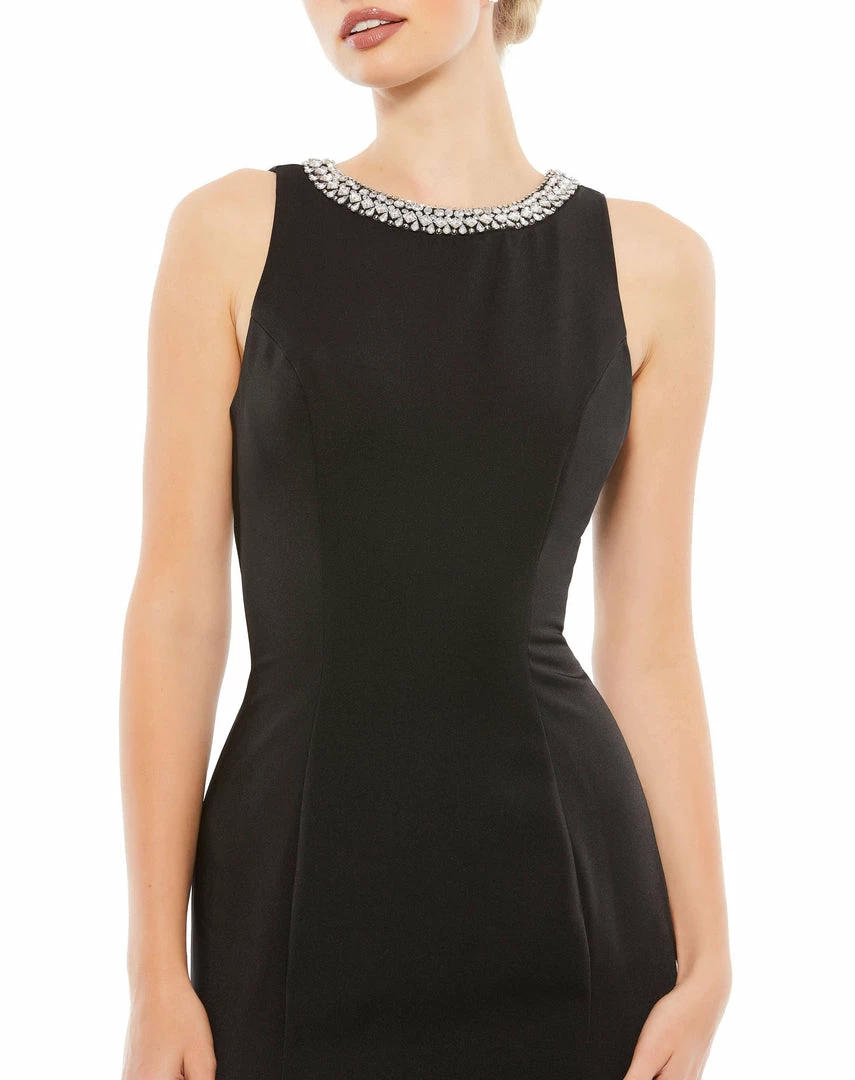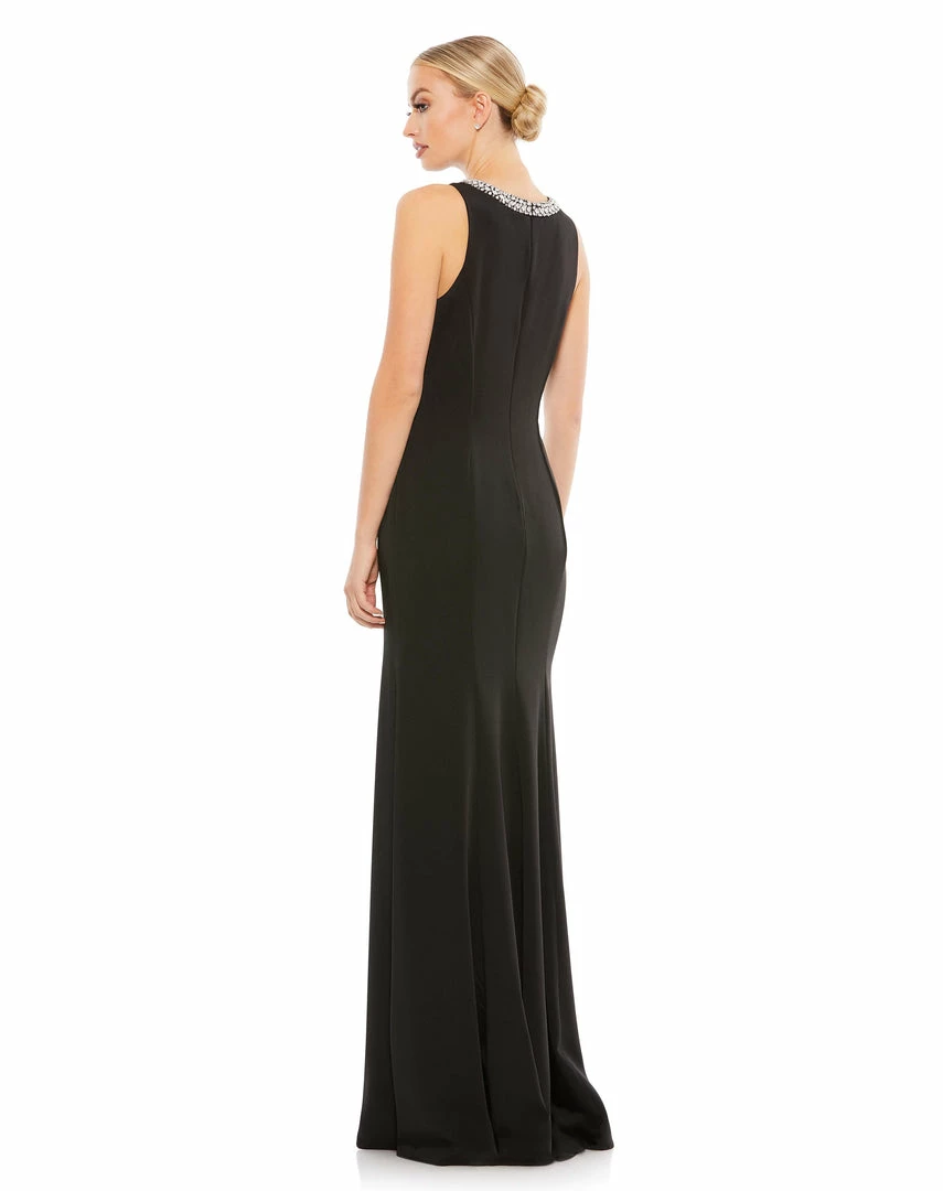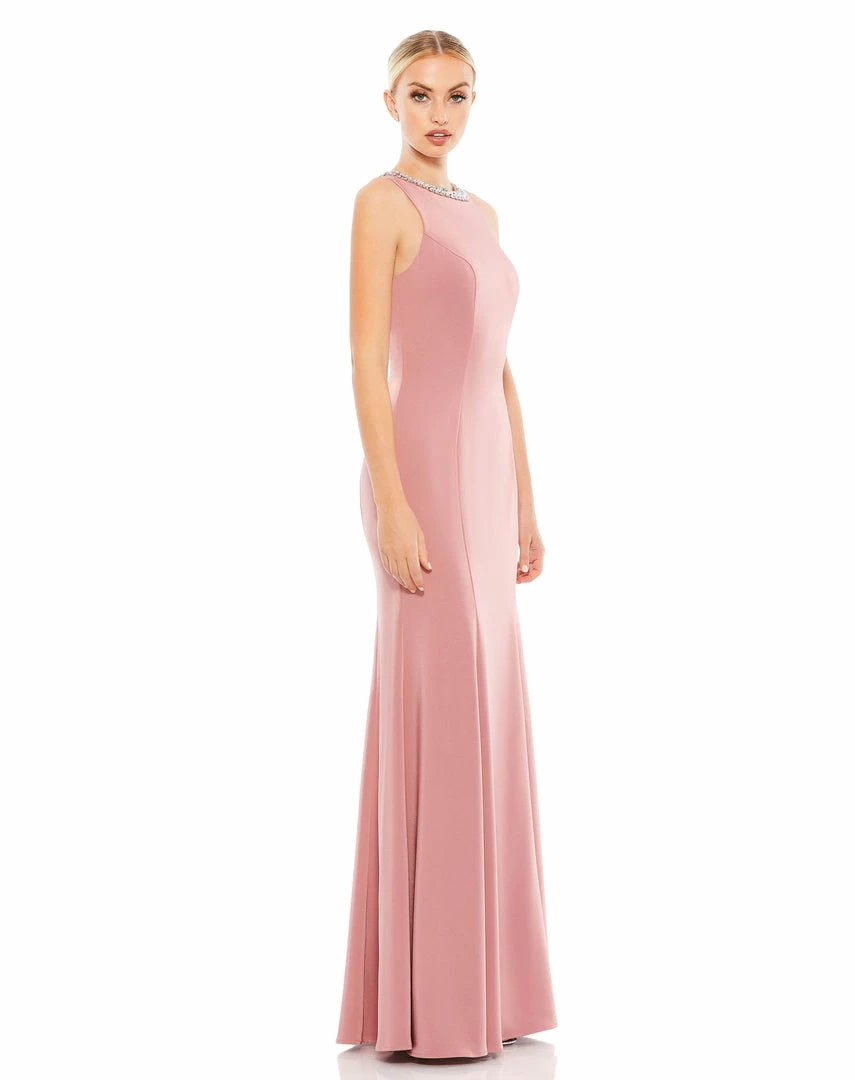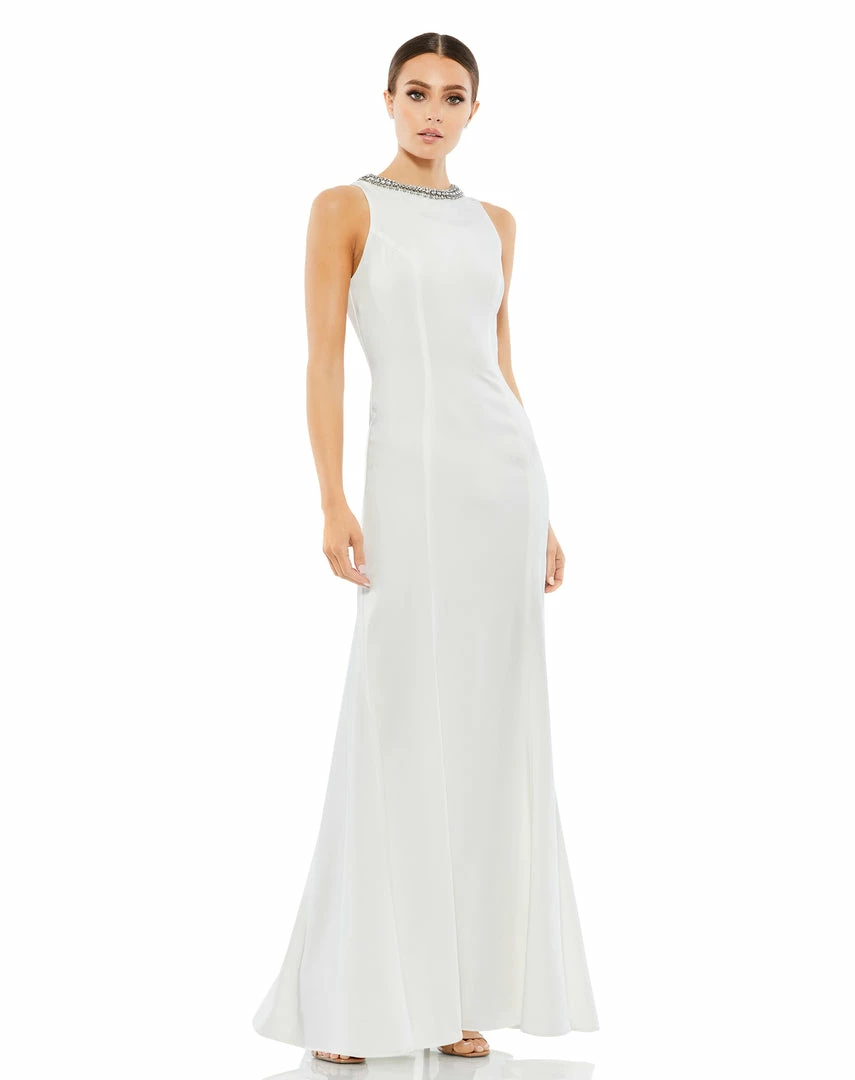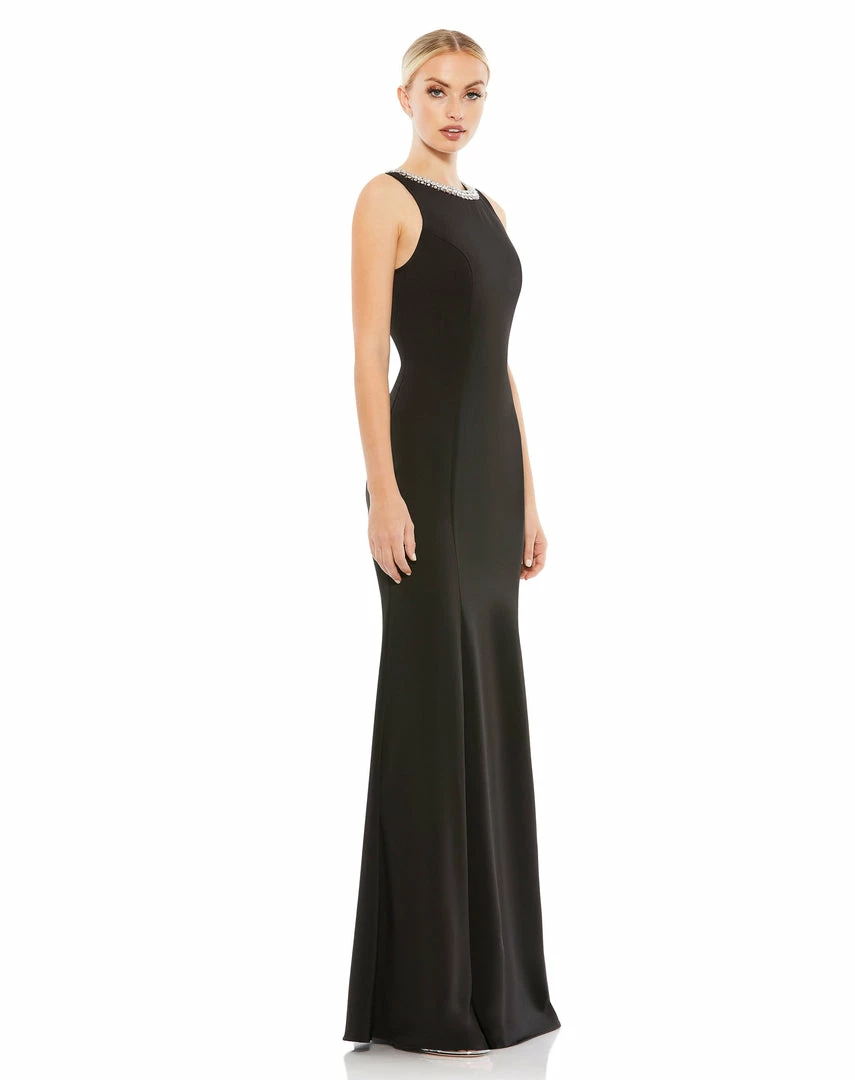 This dreamy satin gown is both classic and elegant. This floor-length, form-fitting trumpet gown is fitted through the bodice and waist and features a flared trumpet skirt. The neckline is encrusted with rhinestones for extra sparkle.