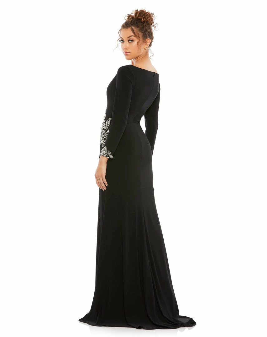 Long-sleeve plunging v-neck jersey gown with a thigh-high front slit and a floral rhinestone-embellished ruched waist.