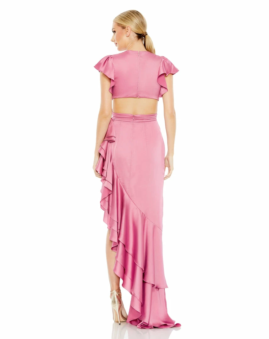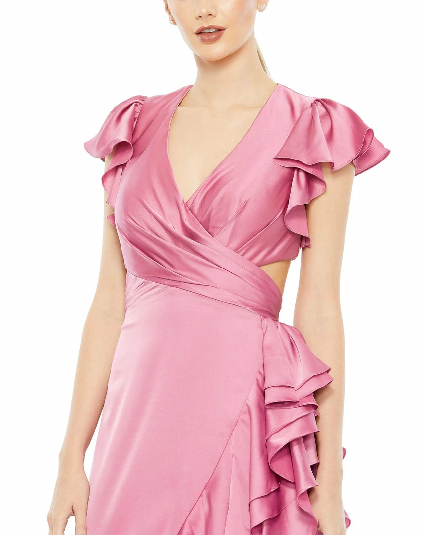 This flirty, feminine dress is perfect for weddings and summer soirées. Made from lustrous satin, the dress has flutter sleeves, a crisscross bodice that becomes a cutout at back, and a diagonal ruffle that starts at the hip and dips past your toes. Wear it with metallic heels for a pretty party look.