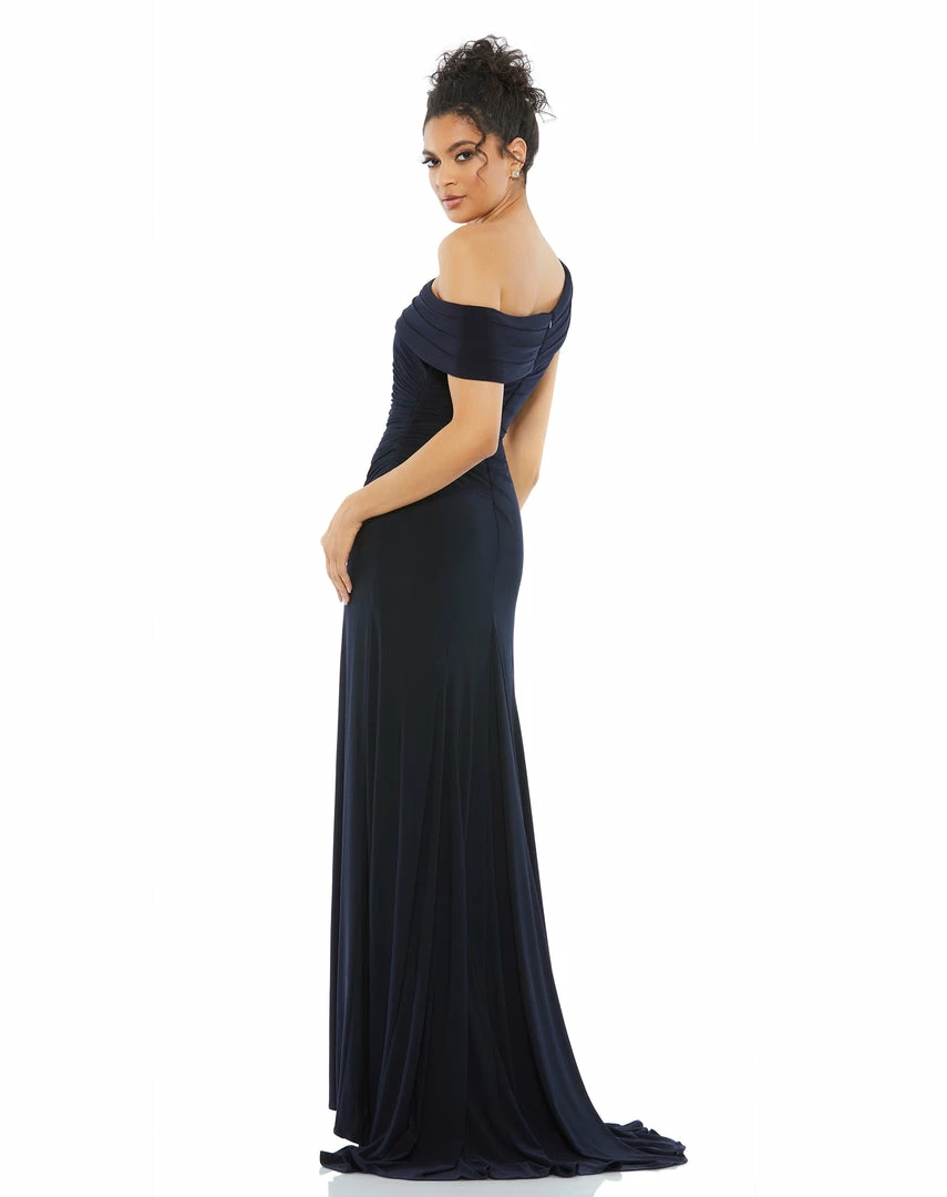 Foldover off-the-shoulder jersey gown with a flattering ruched bodice and a thigh-high slit.