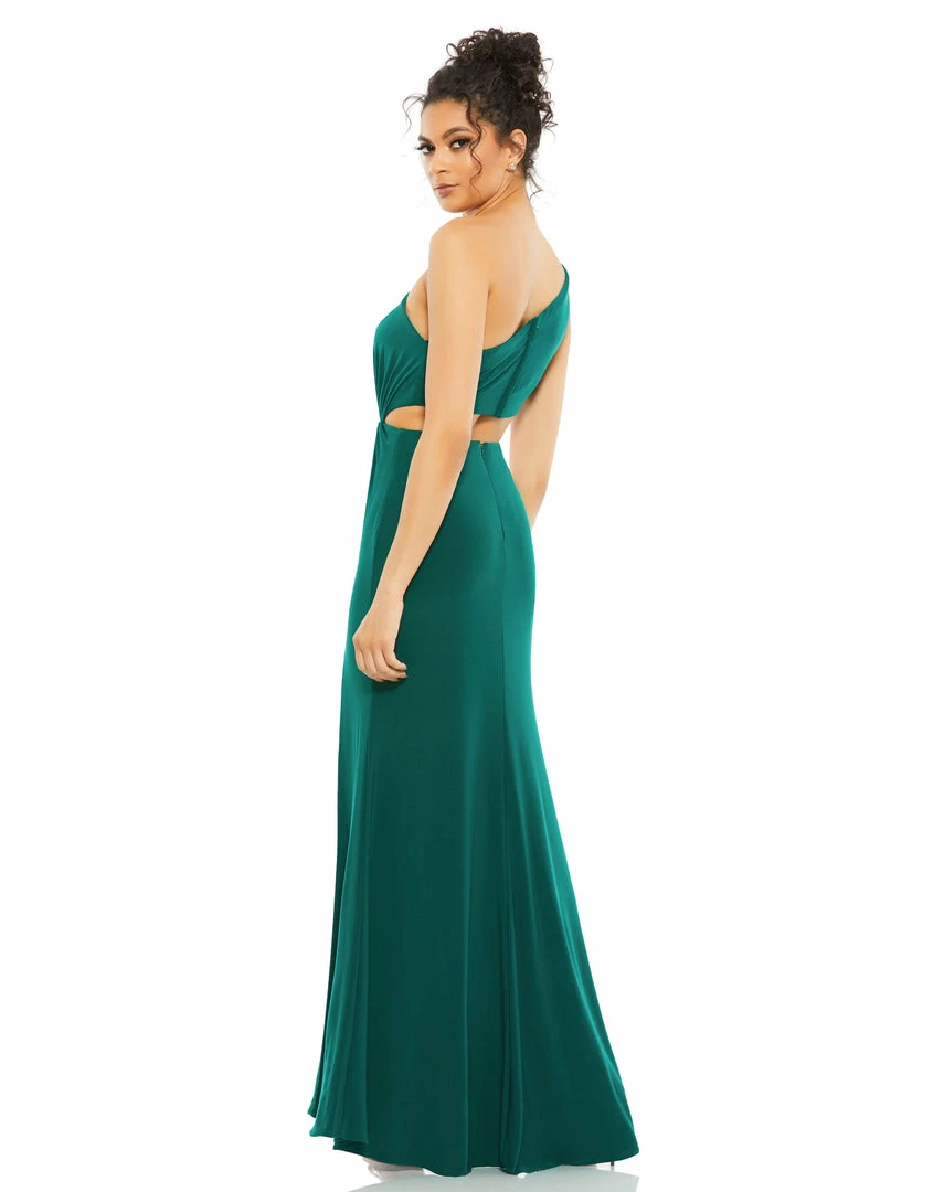 One-shoulder gown with a sexy wrap-around midriff cutout, ruching at the waist, and a floor-length skirt with a thigh high slit.