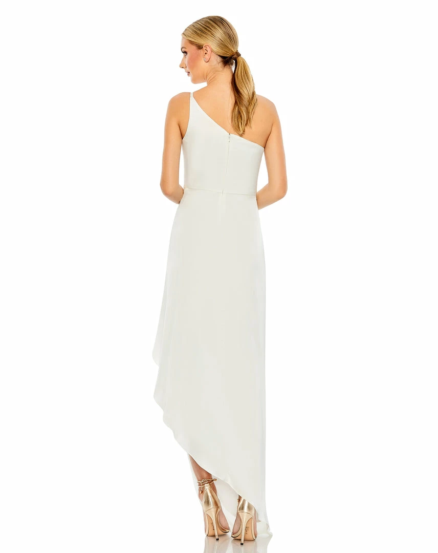 Sexy one-shoulder draped satin dress with a a hi-low hem and daring slit.