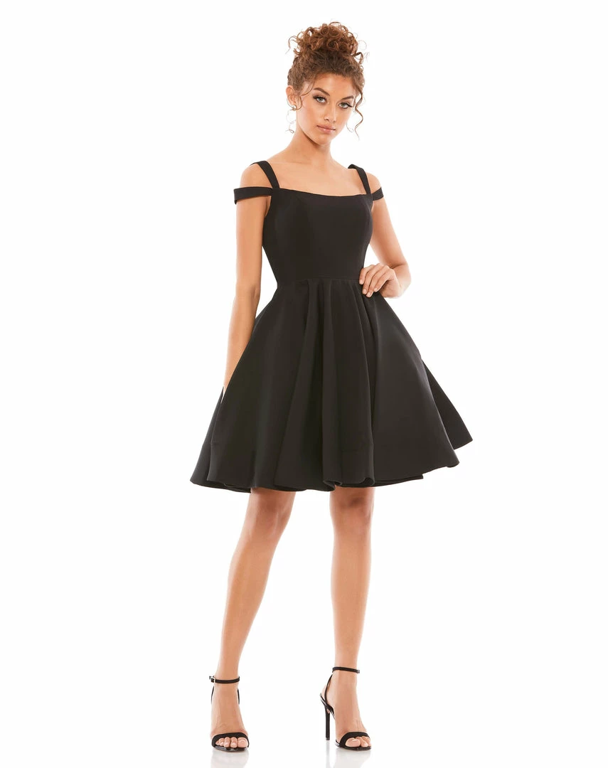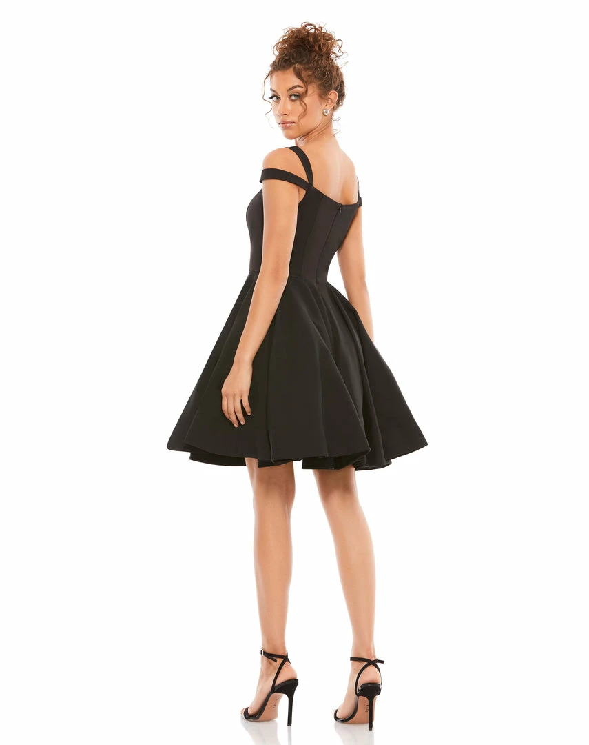Flirty cold shoulder skater cocktail dress with pockets.