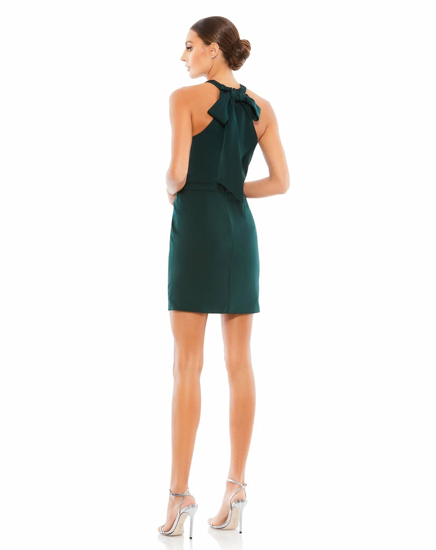 Form-fitting cocktail dress with a cross-front halter neckline and dramatic bow in the back.