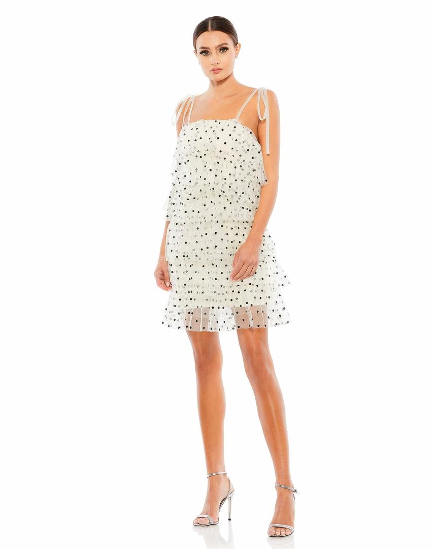 Flirty layered tulle polka dot cocktail dress with a straight neckline and tie shoulder straps.