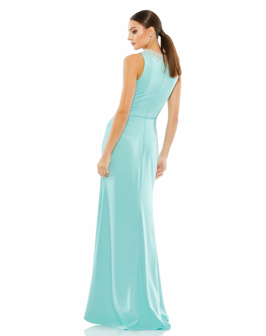 Form-fitting column gown with a beautiful rhinestone-embellished collar, seaming detail at the natural waist, and a leg-baring front slit.