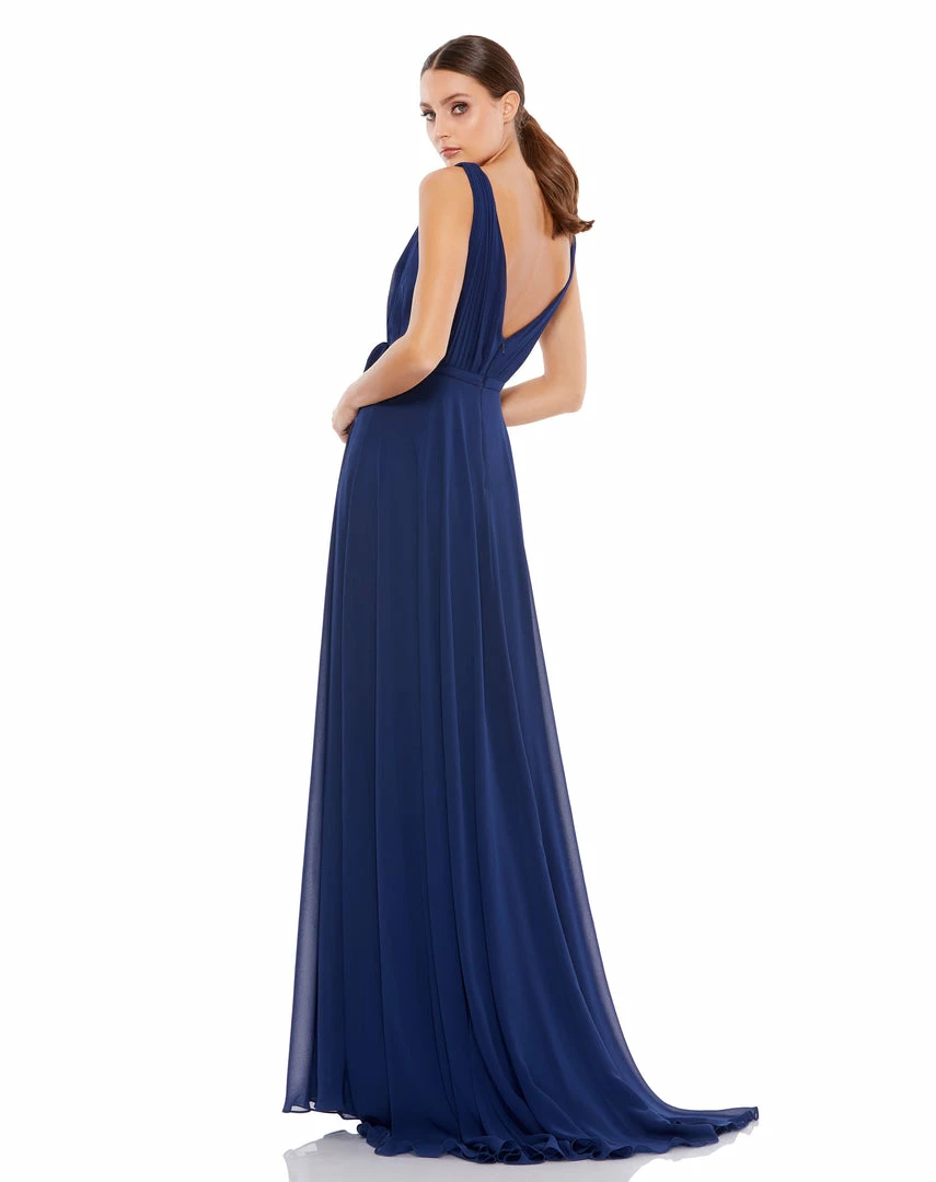 A-line chiffon gown with a pleated bodice, v-neckline, thigh-high slit, and a tie-accented waist.