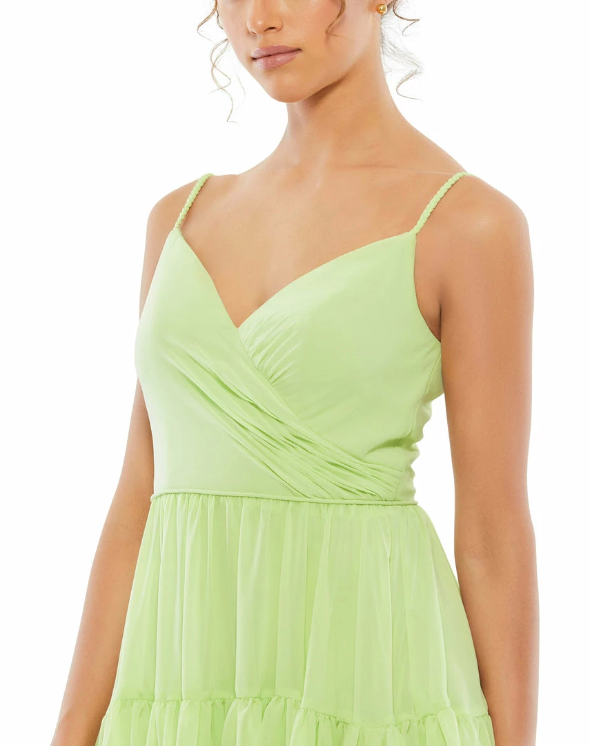 Spaghetti strap faux-wrap mini dress with a v-neckline and tiered skirt.