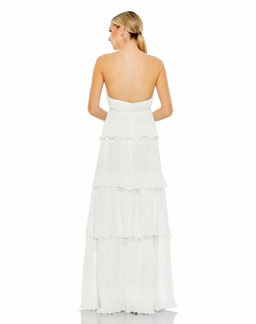 Layered ruffle pleated maxi dress with a v-neckline and a sexy strappy back.