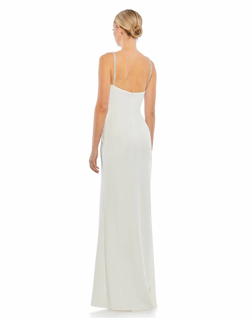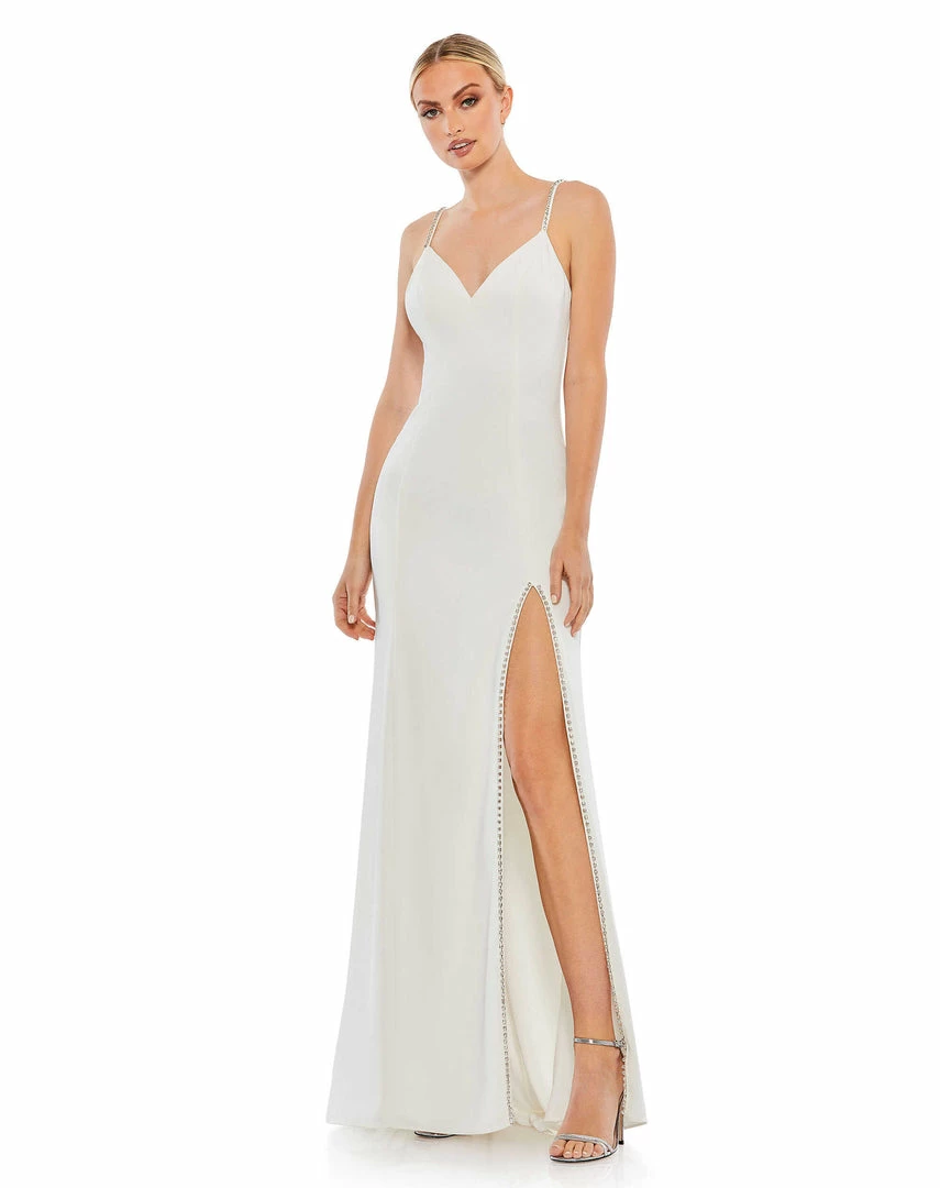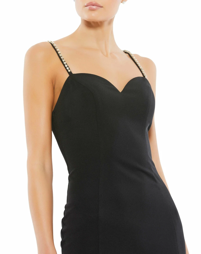 - Rhinestone trimmed thigh high slit