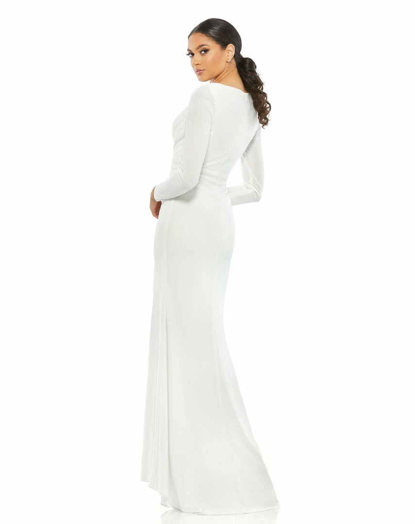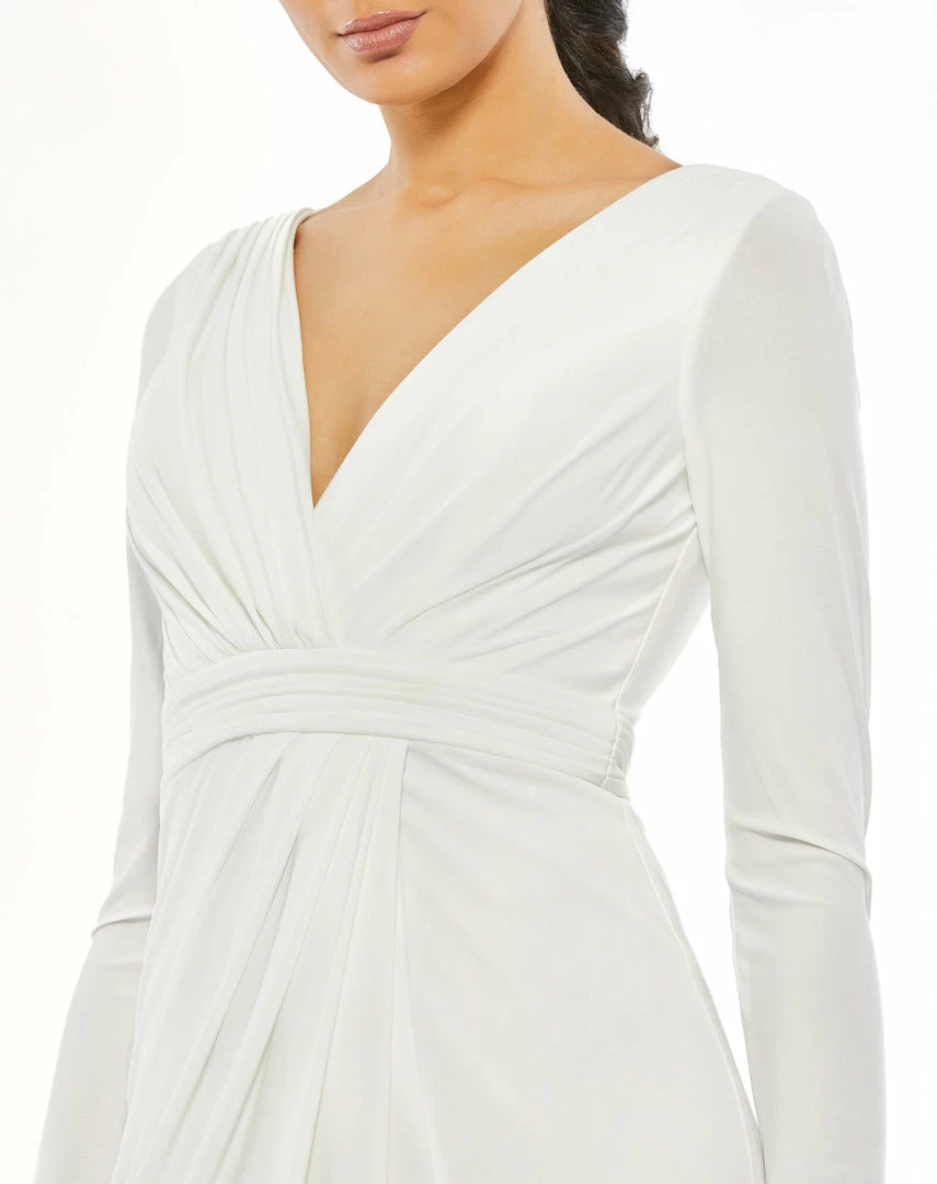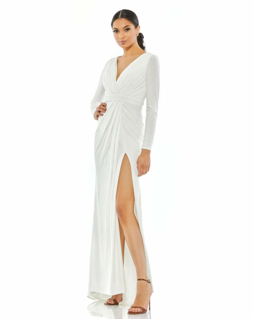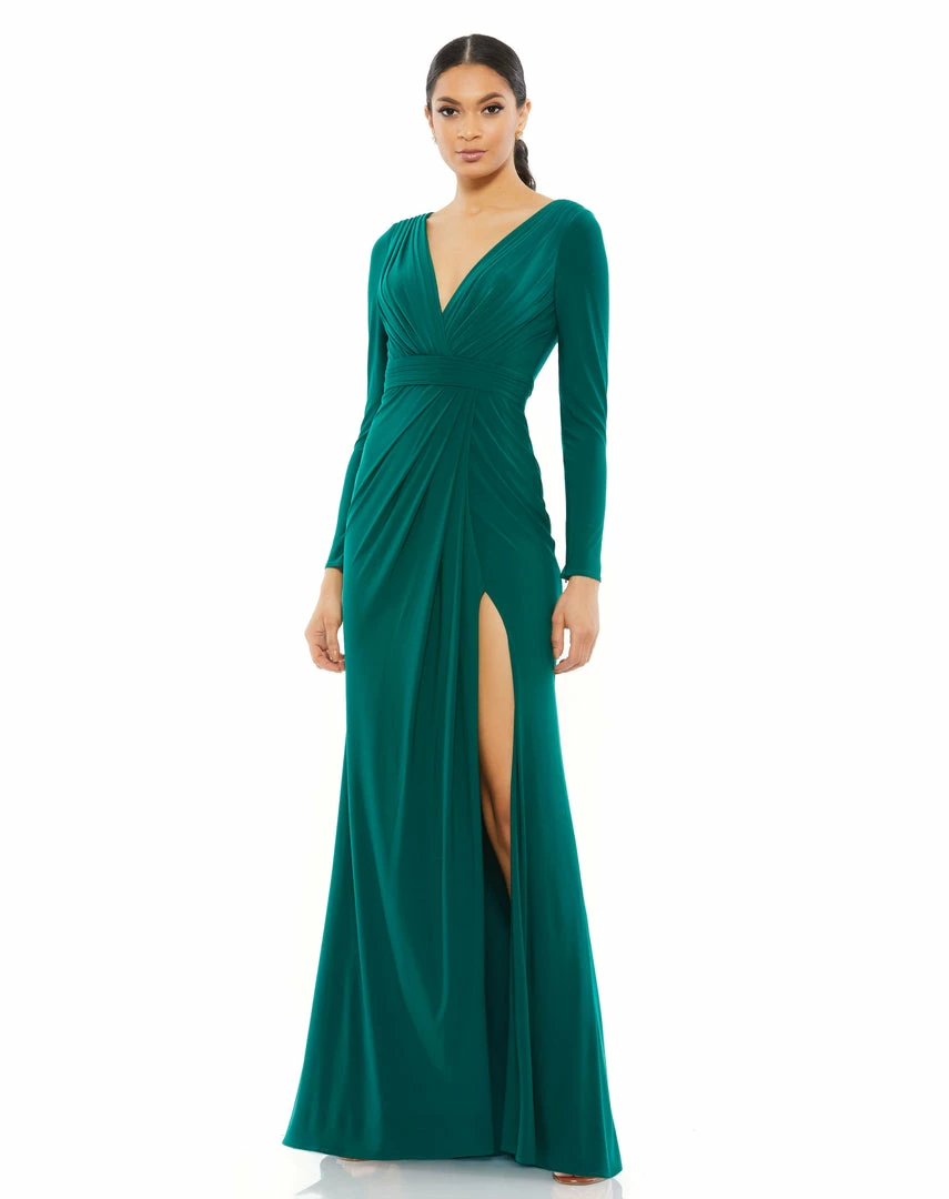 Classic long sleeve jersey evening gown with v-neckline, pleated bodice, draped skirt, and a thigh-high slit.