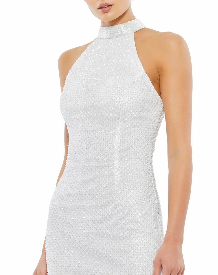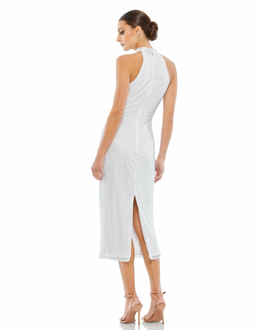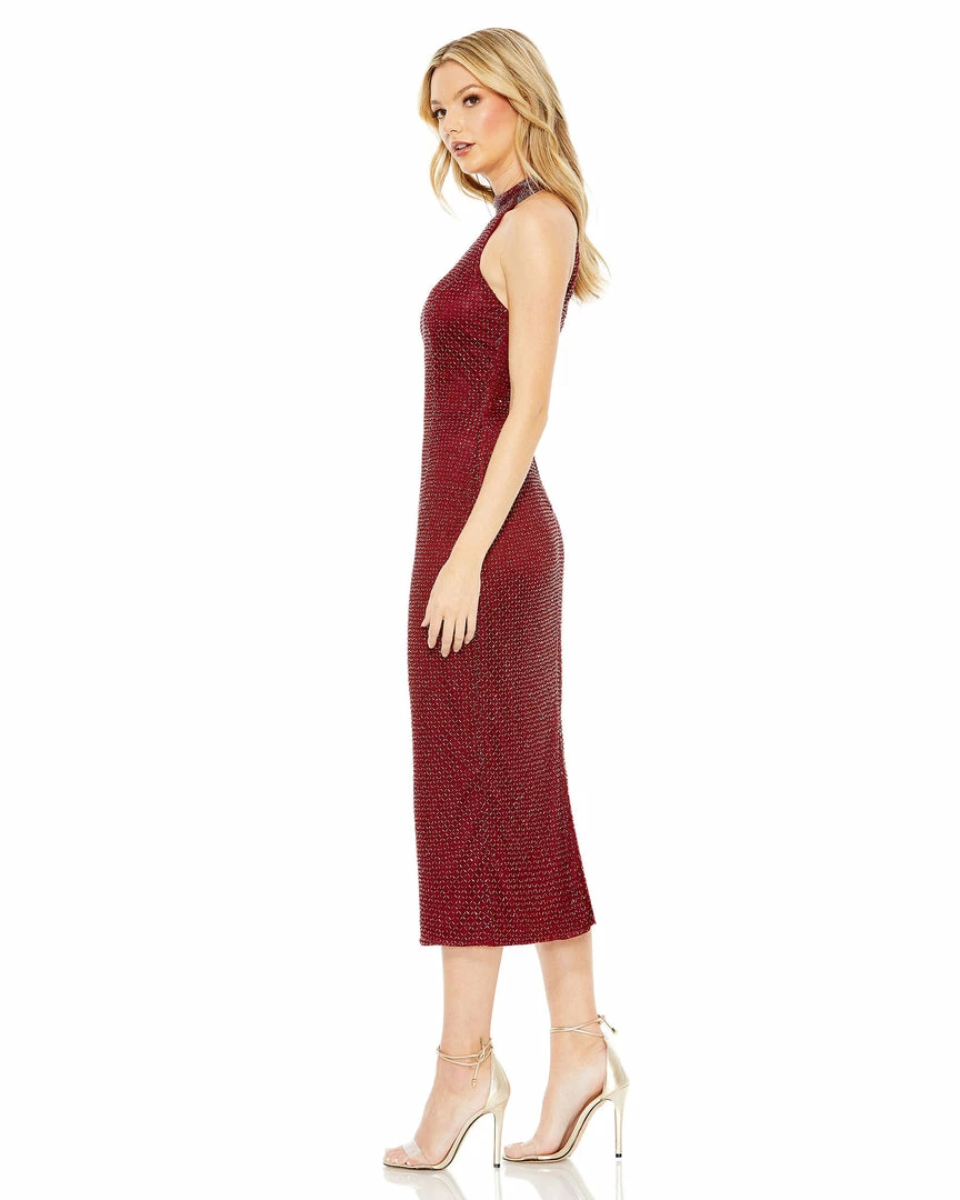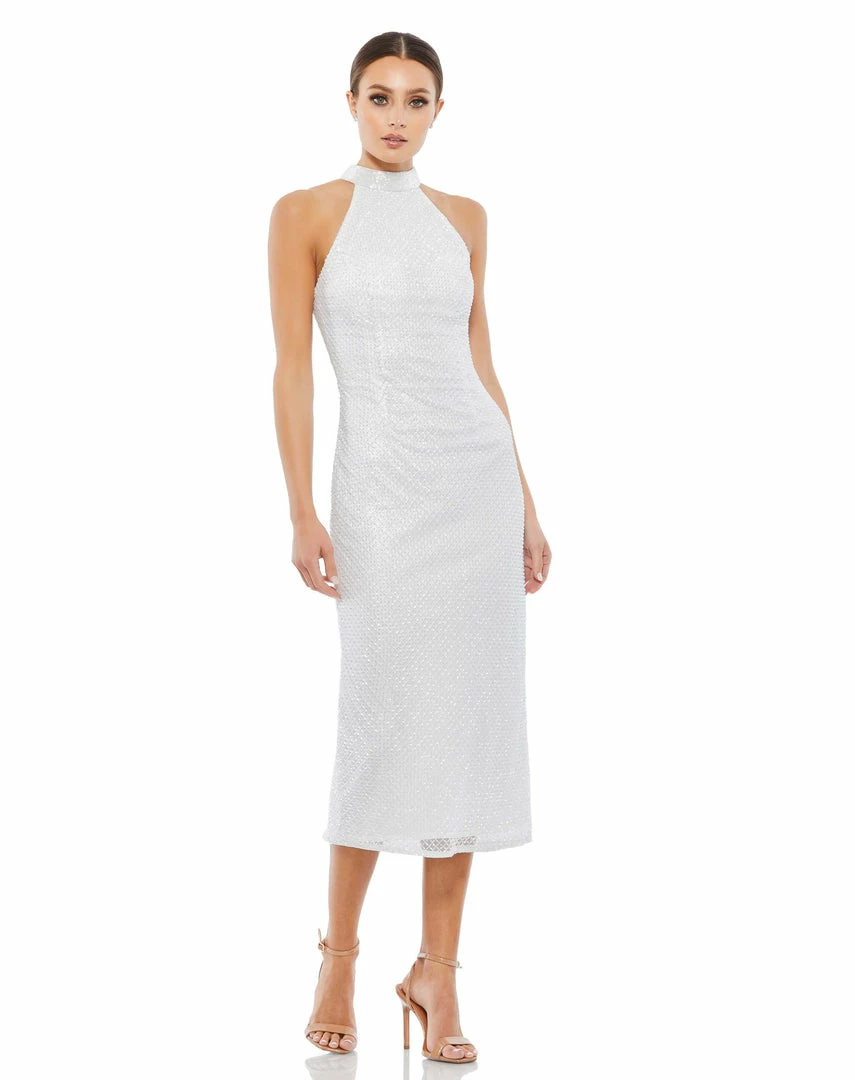 Chic high-neck halter midi dress with diamond-patterned beading throughout the overlay. This midi sheath dress features a back zipper and back center slit.