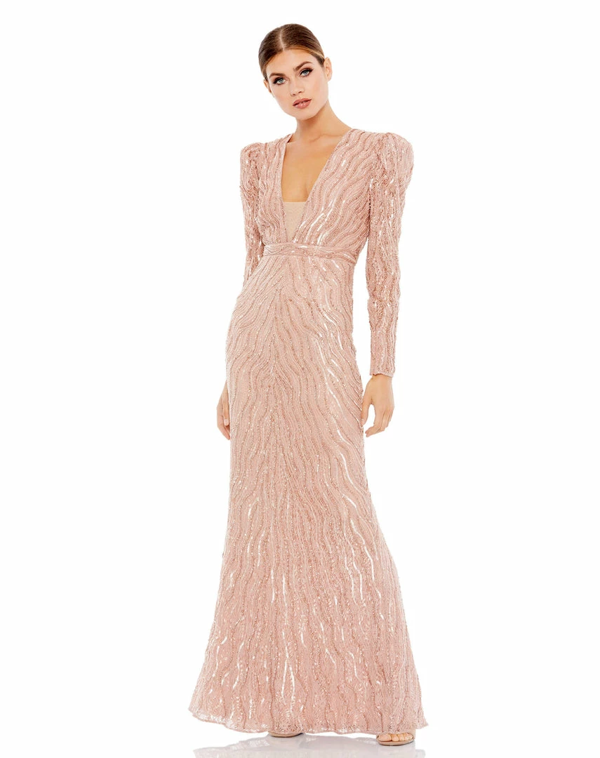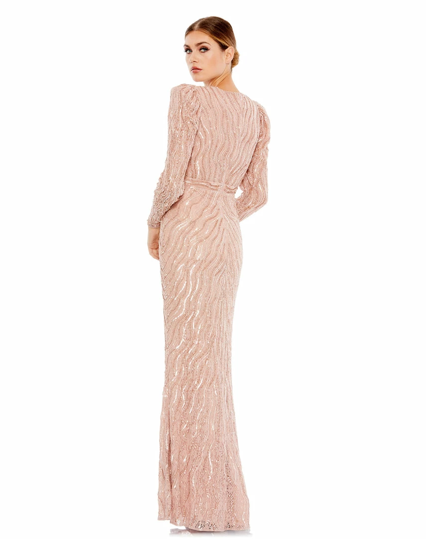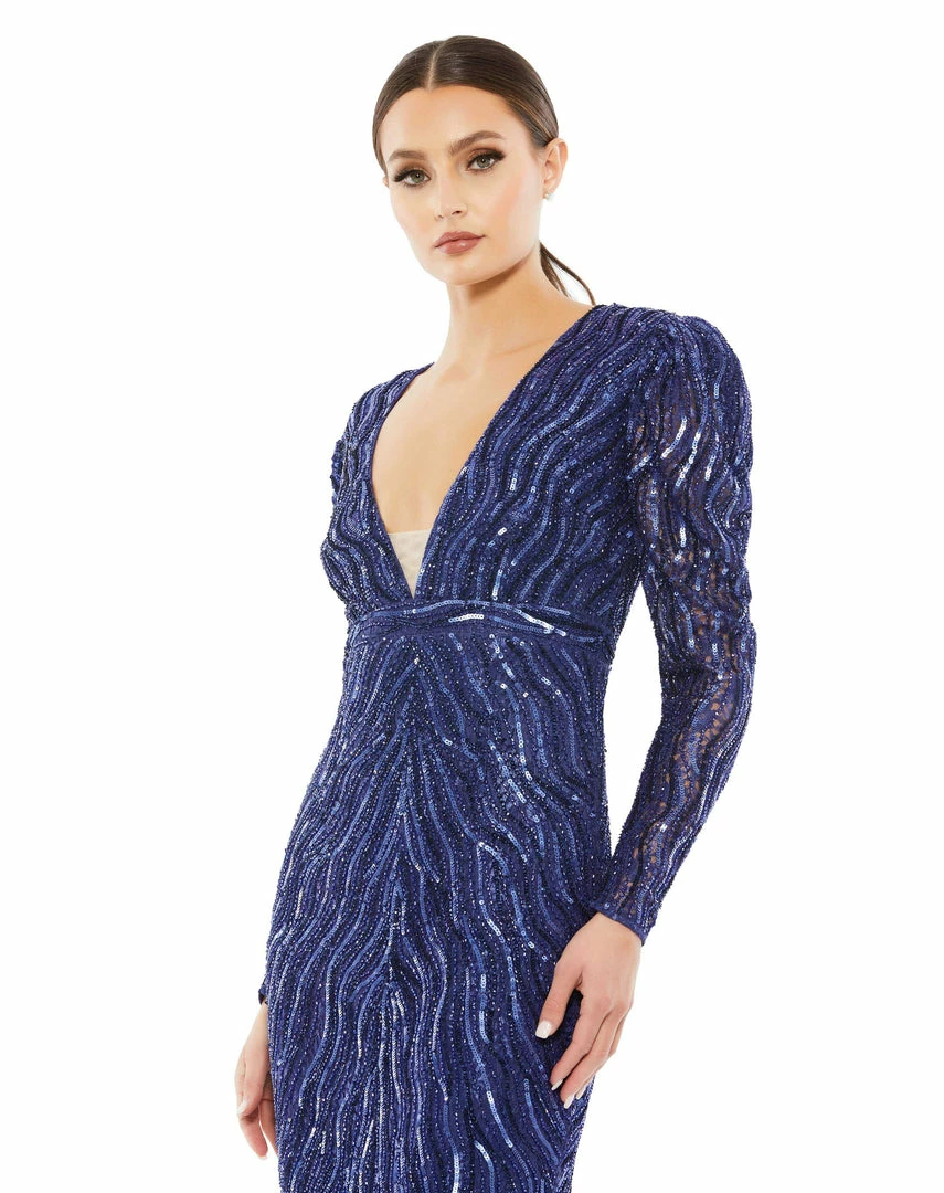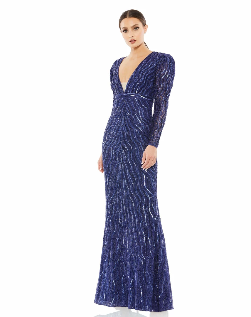 Elegant puff sleeve trumpet gown adorned with sequins and beading throughout. Plunging v-neckline features a semi-sheer mesh inset, and an embellished waistband defines the waist.